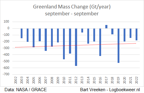 Hoe definieer je dan het 'kantelpunt'? Het is me bekend dat bijna alle gletsjergebieden op aarde massa inleveren. Daar is de toenemende afsmelting dus groter dan de (al of niet) toenemende sneeuwval. Maar of die situatie al bereikt is op Groenland en Antartica is zeer de vraag. De laatste jaren lijkt het massaverlies minder te worden, zie figuur. Maar de jaarlijkse variatie is groot, dus statistisch is dat niet erg zeker. En bij voortgaande opwarming wordt de situatie weer anders.
