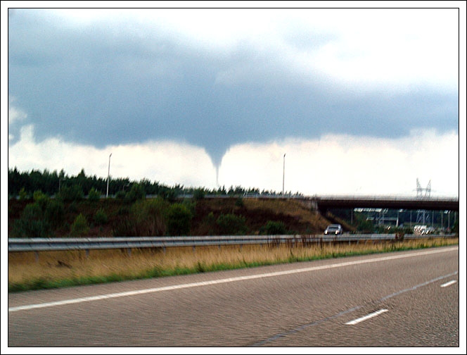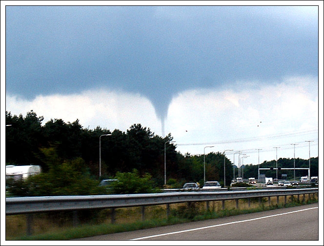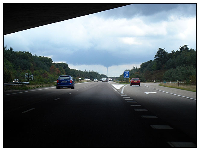Daarna bleef de hoos voortdurend zichtbaar door de wonderlijk gunstige richting van de snelweg. De tweede foto toont het beeld enkele minuten later.