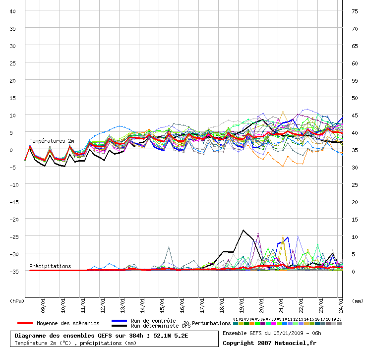 Voor de korte termijn is de oper qua T2m veel te koud ten opzichten van het ensemble en na de 12e is het gedaan met de vorst in grote delen van het land. De spreiding qua luchtdruk is groot na de 11e maar het merendeel voorziet toenemende depressie invloeden en dus een dalende luchtdruk.