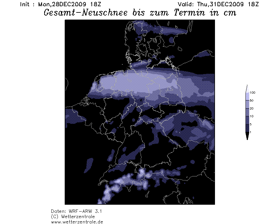 Ik denk dat dit kaartje van WRF redelijk juist is qua hoeveelheid, echter schuift in mijn inschatting het gehele sneeuwgebied 50km naar het noorden.