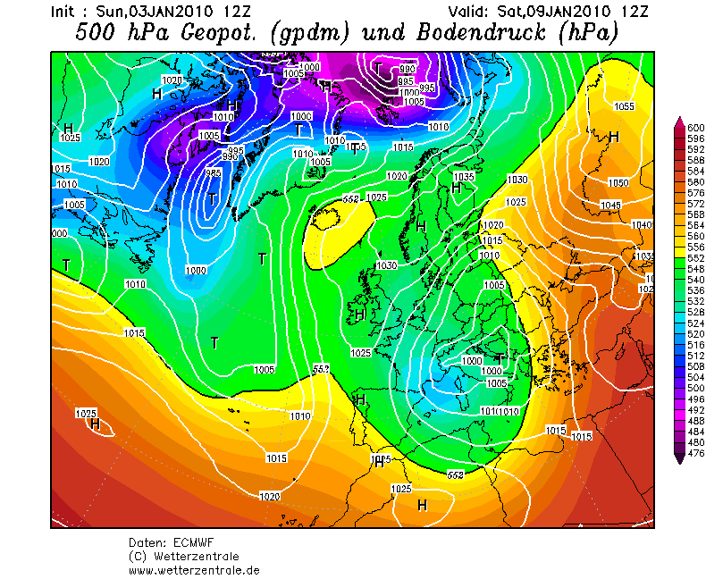 strakke stroming uit ono, depressie bij Italie in de buurt, hogedruk van Sint Petersburg, via Oslo naar Reykjavik.
