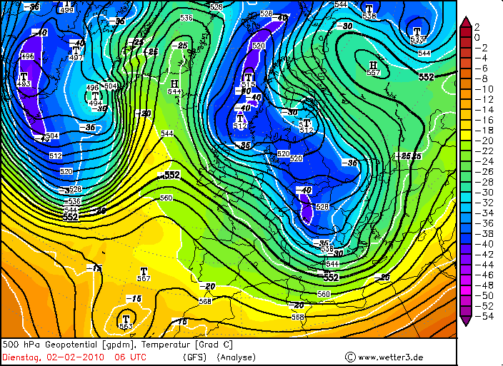 (nb hier staan in de zwarte lijnen ook de isohypsen (hoogtelijnen) v/h 500 hPa-vlak op geplot - deze kaart is dus eig 3 in 1