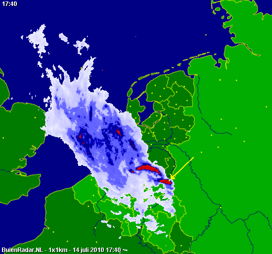 Het gebied aan de linkerkant was precies het gebied wat vlak daarna de punt van "de kink" in de buienlijn werd, waar dus extreem zware windstoten voorgekomen moeten zijn, wat duidelijk te zien was toen het gustfront voorbij kwam. De lucht werd rond deze tijd flink groen, wat op de foto's niet zo goed tot z'n recht is gekomen.