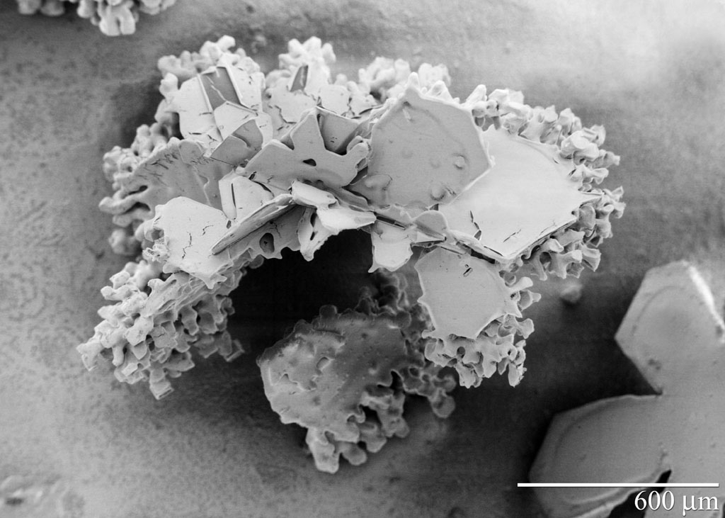 Meer mooie plaatjes van rijp op sneeuwvlokken, korrelsneeuw en korrelhagel, bekeken onder een microscoop, via de link.