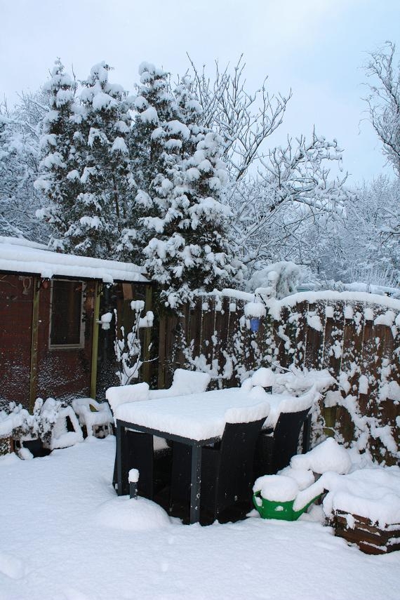 Net even snel naar buiten, was tijdelijk droog om wat foto's te maken. Inmiddels weer matige sneeuw bij -0,4 gr en sneeuwdek van ongeveer 16 cm.
