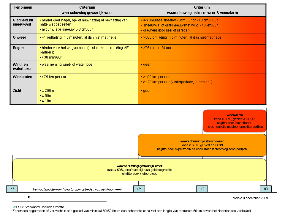Een waarschuwing extreem weer heeft dezelfde criteria als het weeralarm, maar kan uitgegeven worden op eigen inschatting van het KNMI. Daarbij geldt wel dat de kans op uitkomst tenminste 60% moet zijn, al is die inschatting subjectief. Er had dus tenminste een waarschuwing extreem weer uitgegeven moeten worden. Of een weeralarm nodig was, is wat moeilijker in te schatten. Het 'impactteam', bestaande uit mensen van het KNMI, ANWB, Rijkswaterstaat, enzovoorts, maakt een inschatting van de impact van het alarm en de toegevoegde waarde t.a.v. bestaande berichtgeving. Als er een waarschuwing extreem weer was geweest, had ik het persoonlijk niet gedaan. Maar aangezien er geen enkele serieuze waarschuwing voor Limburg uitstond, had een weeralarm in dit geval veel toegevoegd.