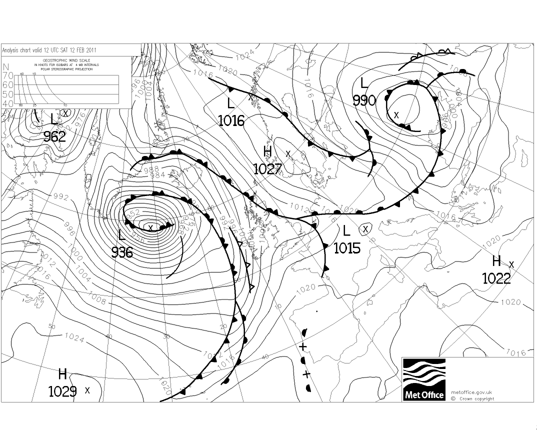 Vergeet niet, dat hoe dichter bij de pool hoe dichter de isobaren noodgedwongen op elkaar getekend worden. De Bracknellkaarten zijn daarom vergezeld van een legenda om een juiste indicatie voor de windsnelheid te geven.