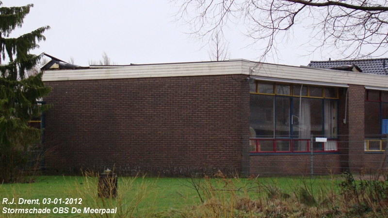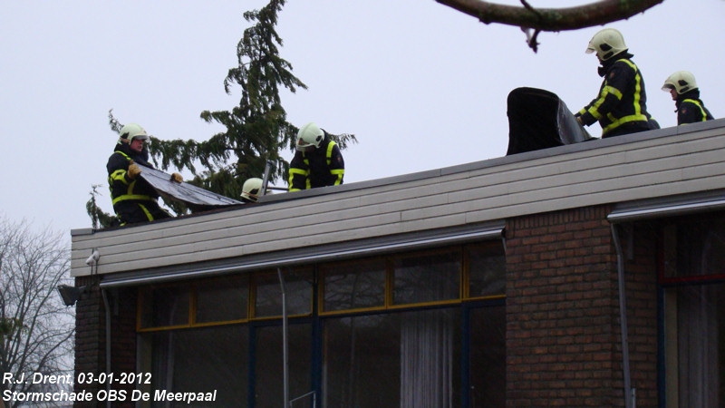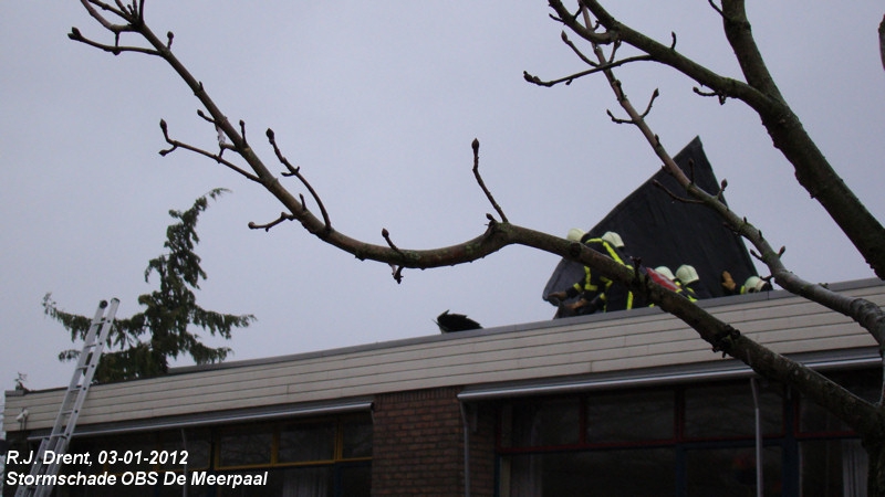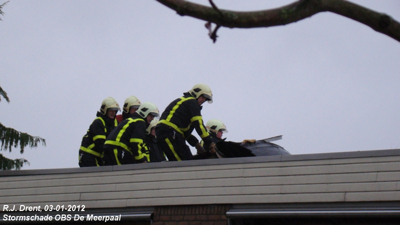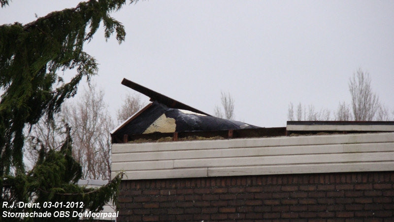 Rond 14.25 uur kregen we de melding van stormschade bij de school waar onze kinderen op zitten. We zijn gelijk in de auto gesprongen om te kijken. Er bleek een stuk dakbedekking los gewaaid te zijn. De brandweer moest er bij komen.