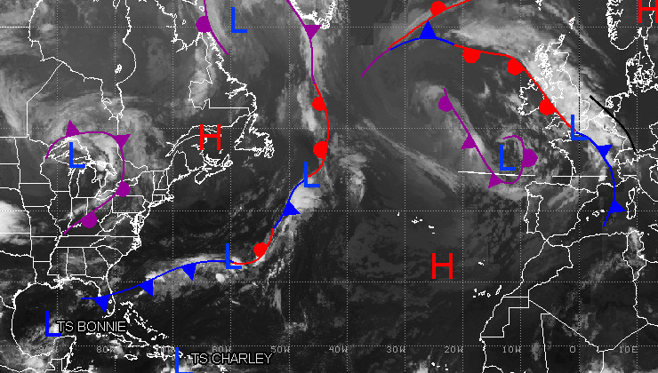 Ten zuidwesten van de Dominicaanse Republiek is gisteren tevens de tropische depressie drie ontstaan, die vanochtend verder is aangesterkt tot de tropische storm Charley. Dit systeem beweegt zich west-noordwestwaarts ten zuiden van Cuba en naar verwachting sterkt het systeem aan tot een categorie één orkaan binnen twee á drie dagen. De koers daarna is vermoedelijk verder de Golf van Mexico in.