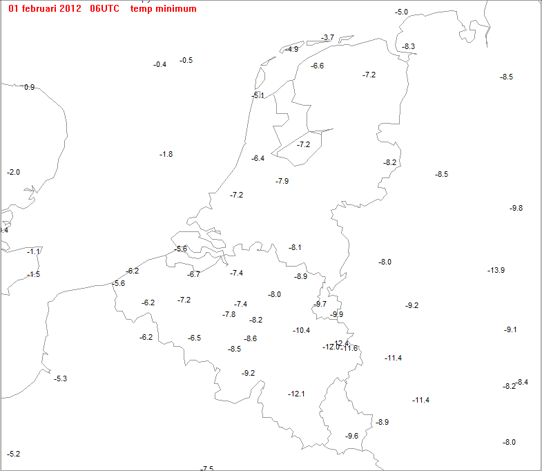 Hier kaartje met de Tn zoals de SYNOP-stations vanochtend doorgaven.