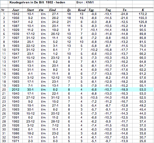 Hieronder een lijstje met koudegolven. Op basis van het koudegetal nu op de 20e plaats. Mogelijk komen we deze week nog in de top tien, naast 1979.