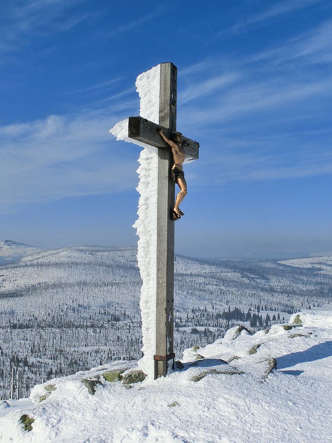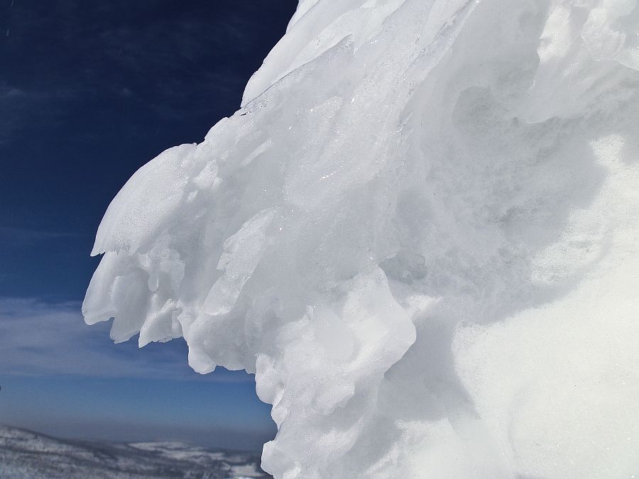 Op deze top was de temperatuur midden op de dag toen -13,0°C, dit bij een gemiddelde windsnelheid van 65 km/uur (windkracht 8), de windstoten bereikten soms snelheden tot 90 km/uur. De windchill schommelde daar doorgaans tussen -25°C en -31°C, langer dan 2 minuten in de volle wind hield je niet vol, ik voelde dat mijn tranen in de ogen begonnen te bevriezen, wel gevaarlijk natuurlijk.