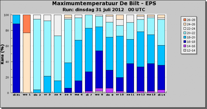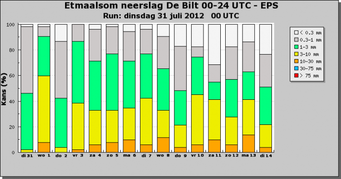Ik zie die stabilisatie niet terug in de Staafdiagram. Vanaf donderdag bijna 1 week meer dan 70% kans op 1mm of meer neerslag. Ook de temperatuur is aan de lage kant. Met na vrijdag temperaturen die eerder onder de 20c blijven steken dan er boven komen. Normaal is bijna 23c.