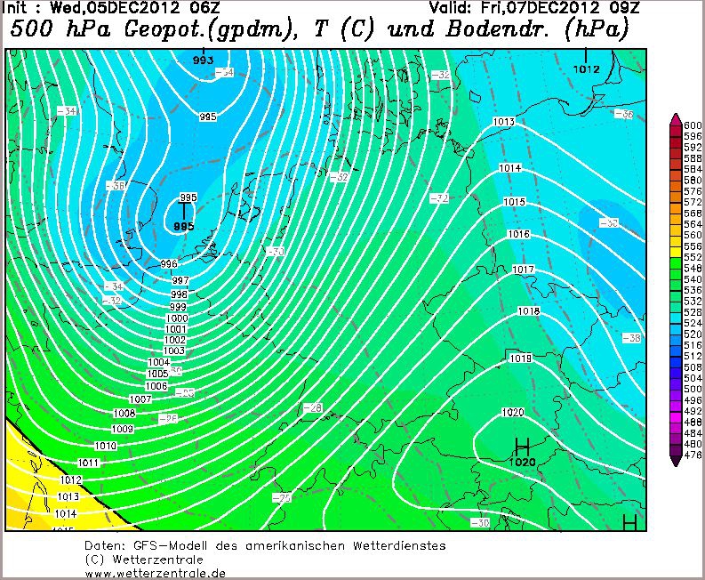 Natuurlijk komt de wind niet rechtstreeks van zee bij ons, maar met een boogje uiteindelijk wel. Ik doel op onderstaande kaart. De lucht draait toch om de kern heen? Die kuststrook in Belgiƫ en Noord-Frankrijk is echt niet in staat het verschil uit te maken tussen aflandige- en aanlandige wind. De temperatuur speelt ook een rol. Aan de kust zal het volgens mijn verwachting net iets te zacht zijn voor sneeuw. Wat ik ook al tegen Robin zei, ik hoop dat jij gelijk krijgt en ik niet.