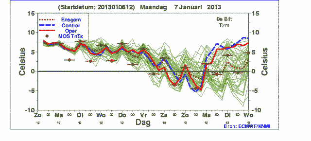 Het is altijd aardig om te kijken hoe de pluimen er de afgelopen twee weken hebben uitgezien. Ik ben even door Sjoerd's archief gestruind (eeuwig hulde voor het bijhouden ervan!) en kwam de volgende pluim tegen van 10 dagen geleden. De MOS bolletjes zaten er maar 11 graden naast voor vannacht. Verder zie je *geen* lijntje dat de minima van vannacht in de smiezen had. Ik bedoel niet niet afzeikerig, maar meer relativerend. Kijk en glimlach: