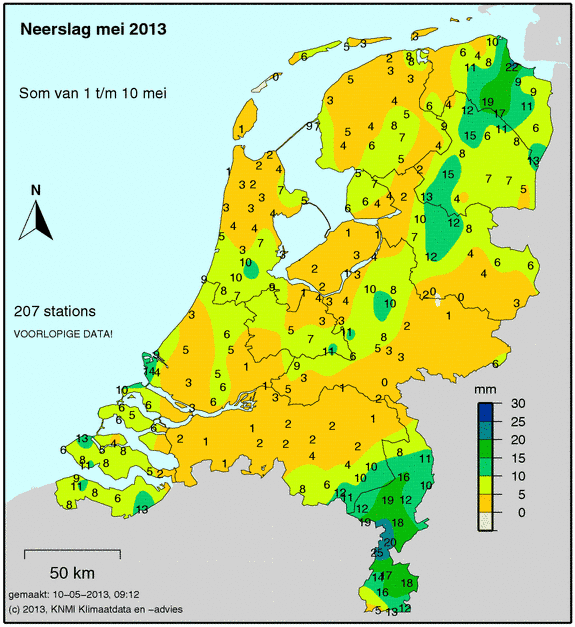 over bijvoorbeeld de hoeveelheid neerslag? Het KNMI kaartje geeft voor Wageningen namelijk 6mm neerslag (van 1 t/m 10 mei) en het weerstation Veenkampen geeft op 8 mei 11,93mm neerslag (meer overeenkomend met de pittige buien die hier woensdagavond ontstonden)...