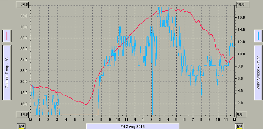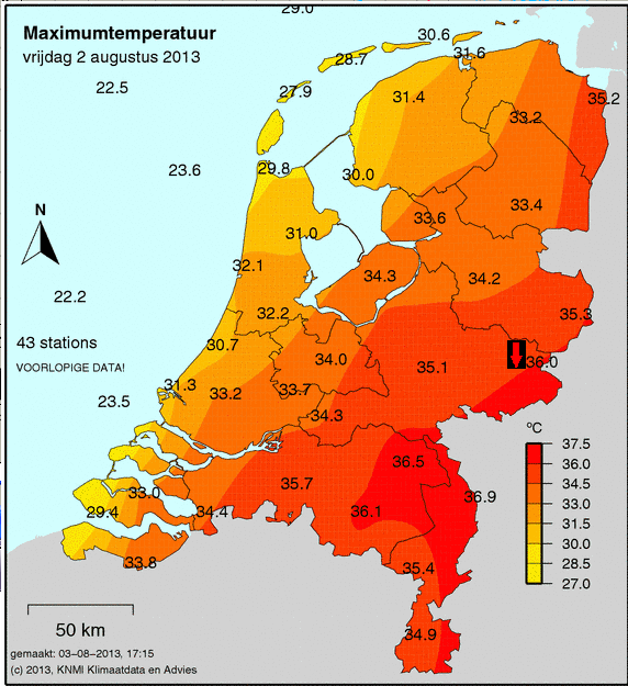 Gisteren mat ik een maximum temperatuur van 33,3 graden. Daarmee zat ik 3 graden lager dan de omgeving. Zo had Hupsel 36,0 graden als maximum en Meddo (15 km ZZO van Hupsel) 36,4 graden (V station, B en S stations zaten nog veel hoger). Ik zit 10 km ten westen van Hupsel.