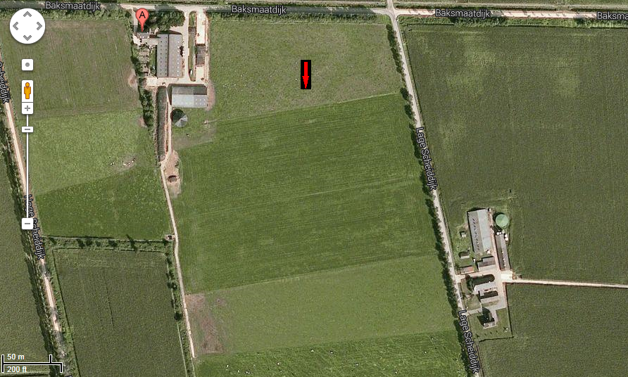Hier is de locatie goed te zien. Naar het zuiden is het weerstation 1,5 km vrij, naar het oosten staan op 100 meter en naar het noorden op 50 meter wat boompjes/struikjes verder vrij. Naar het westen op 50 meter de boerderij maar die heeft weinig tot geen invloed anders zou het weerstation wel te warm zijn i.p.v veel te koud!
