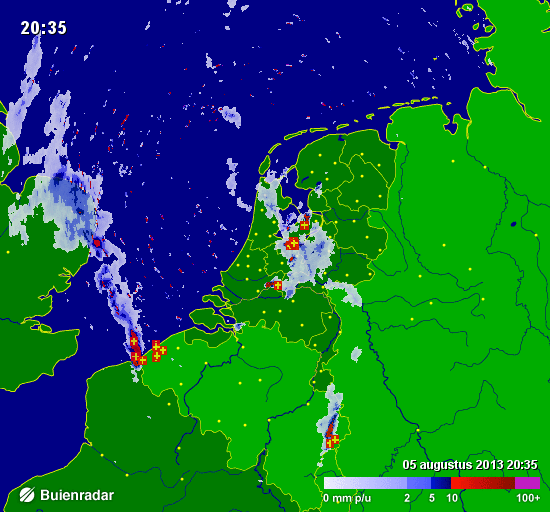 Dit zou bovendien heel goed het restant van de duidelijke supercell waarvan ik foto's gezien heb gemaakt zuidwestelijk van Utrecht. Te zien op dit buienradarfilmpje waar de oplossende bui op het eerste beeld boven de oostpunt van Zuid Holland zit en naar het noorden trekt langs het IJmeer en Diemen waar ik woon. Meer eigen foto's volgen nog.