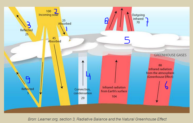Bedankt voor je heldere uiteenzetting aangaande de stralingsbalans van de aarde. In jouw uiteenzetting heb ik de warmtestromen genummerd. In het plaatje dat ik geupload heb (zie link) heb ik de genummerde warmtestromen ingetekend. Corrigeer je me als ik een fout gemaakt heb?