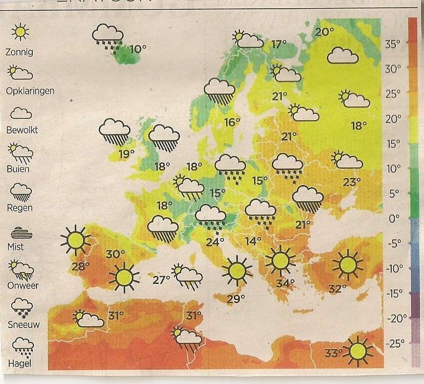 Is de oplossing misschien om op het kaartbeeld ook combinaties van symbolen te gebruiken die niet in de legenda voorkomen? Een onweersbui zonder zonnetje zal iedereen toch wel snappen.