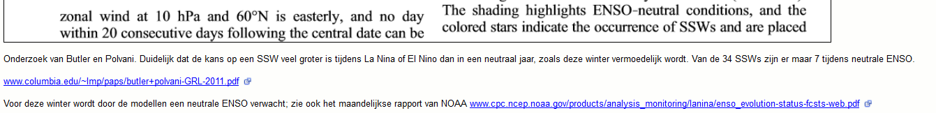Ik zeg dat er tijdens ENSO neutrale jaren een kleinere kans is op SSW (of anders gezegd tijdens La Nina of El Nino grotere kans op SSW), dit blijkt uit het onderzoek van Butler en Polvani. Ik heb dus niet gezegd wat jij hieronder stelt.