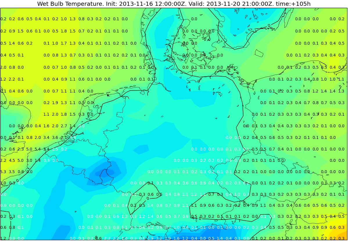 Deze is inderdaad met de OpenDap van de .5 versie (GFS 12Z) gemaakt. De cijfers geven de berekende hoeveelheid neerslag in mm per 3h aan. De contour is de natteboltemperatuur op 2m, berekend op basis van Stull (2011) (zie link onderaan). De zwarte lijn is de nulgradenlijn van de natteboltemperatuur. Neerslag wordt in wit aangegeven als de natteboltemperatuur voor dat gridpunt onder nul is. GFS berekent dus voor woensdagavond wat winterse neerslag voor het westen.