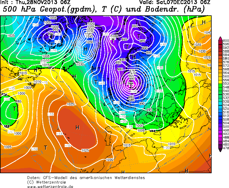 De temperatuurvoorspelling is goed voor west-Spitsbergen, zie 3e plaatje. Als het zo blijft dan krijgen we een blokkade tussen Groenland en Spitsbergen met een behoorlijke noordelijke kou-uitval, het ziet er gunstig uit voor Europa.