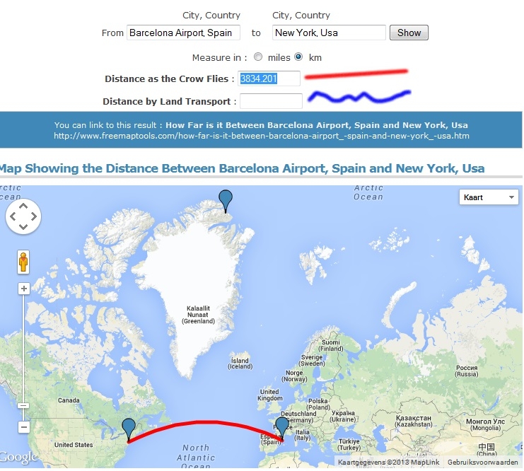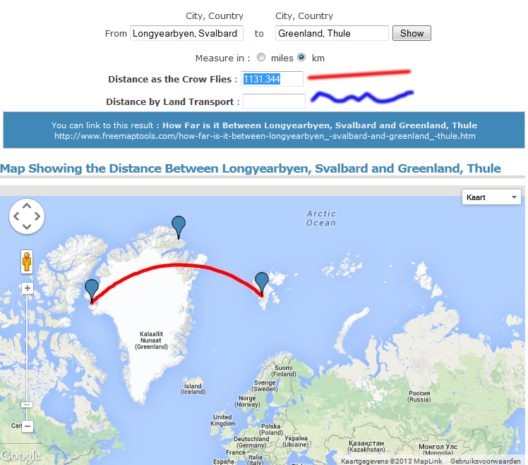 Verder wil ik nog toevoegen dat hoe noordelijker je komt hoe korter de werkelijke afstanden zijn op eeen kaart. Hier maakt men vaak een denkfout. Kijk maar naar de oppervlakte van Afrika uitgezet tegen Groenland. Spitsbergen naar Thule (Groenland) is hier maar 1100 km.