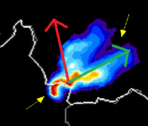 Het enige vreemde vind ik nu dan nog de koers van de bui, aangegeven met een rode pijl in het radarbeeld hieronder. Als ik zo´n radarbeeld als hieronder zou zien, zou ik verwachten dat de bui in oost-noordoostelijke richting trok, dus zoals de groene pijl aangeeft. Een beetje in lijn dus met de sterkste neerslagecho, of hooguit iets meer in noordoostelijke richting. Dat is wat ik zelf tenminste normaal gesproken zie bij cyclonale supercells.