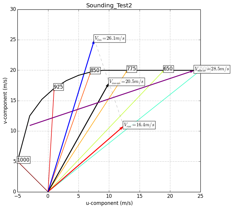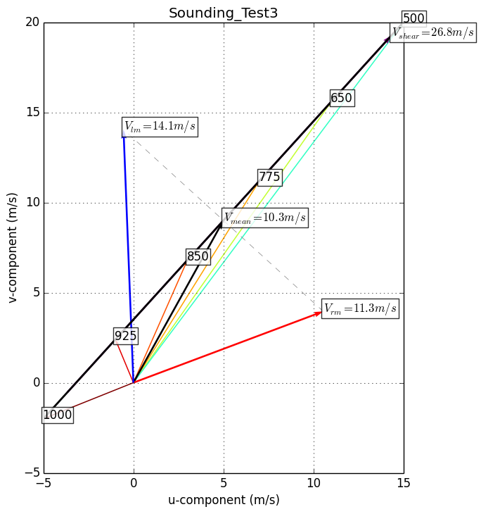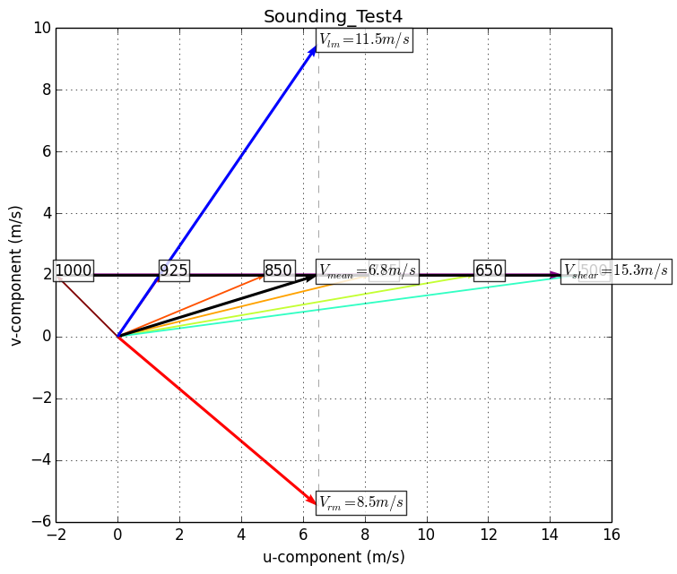 Je zie dat right- en leftmovers altijd resp. rechts en links van de shear vector liggen (zo zijn ze gedefinieerd) en ook vrijwel altijd rechts en links van de mean wind, tenzij we onrealistische dingen gaan plotten zoals een hogere wind aan de grond dan op grote hoogte.