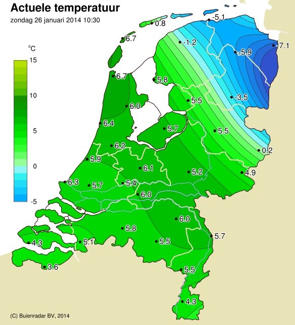Ten noordoosten steeds kouder, ten ZW steeds warmer