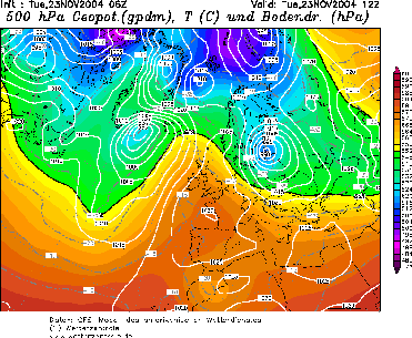 Als je een lage druk op zeeniveau hebt (vb. 990 hPa), zul je logischerwijs niet zo hoog moet klimmen om aan het 500 hPA-vlak te komen als bij een hoge druk op zeeniveau, waarbij je bijvoorbeeld moet vertrekken van 1030 hPa. Dus in lagedrukgebieden ligt het 500 hPa-vlak in de regel lager dan in hogedrukgebieden. Vandaar dus de paarse en blauwe kleur in onderstaande kaartje bij de lagedrukgebieden: