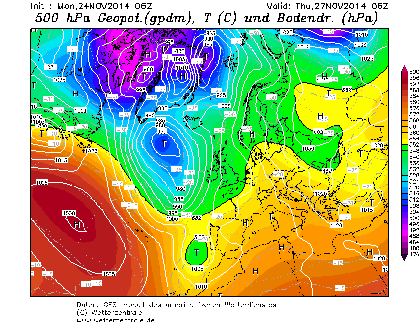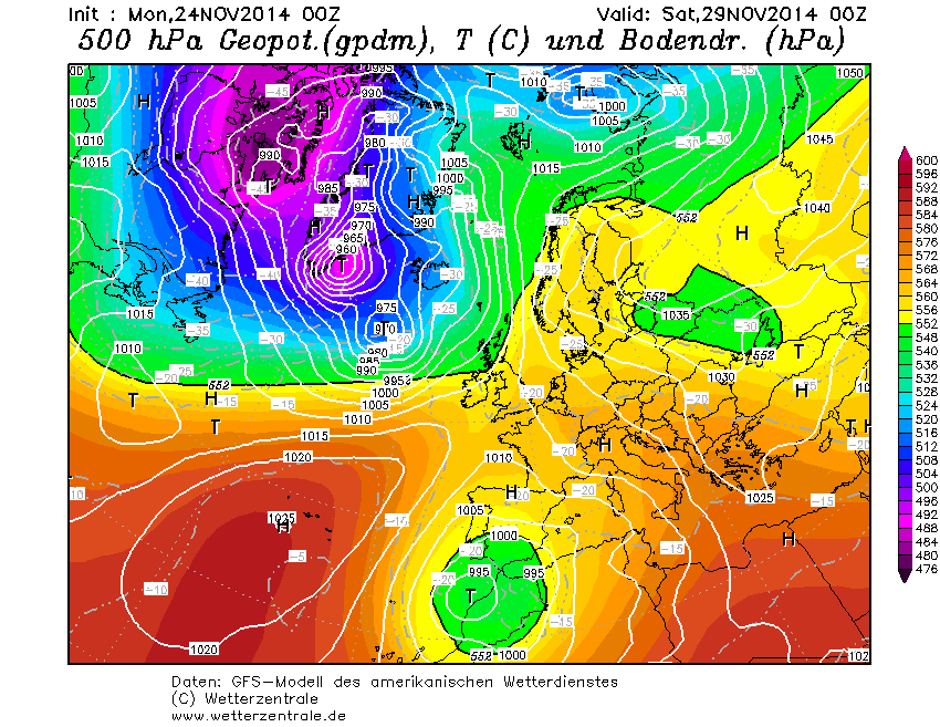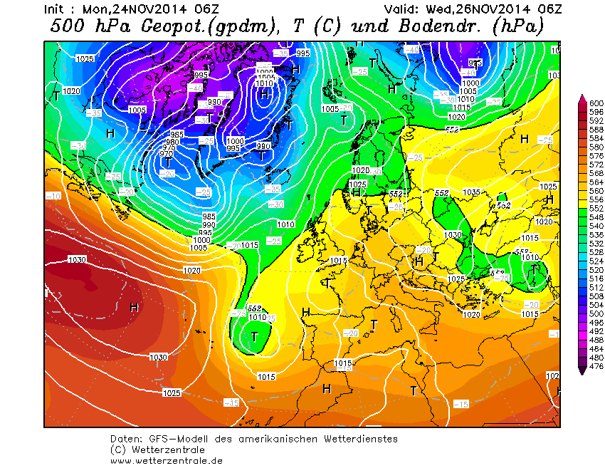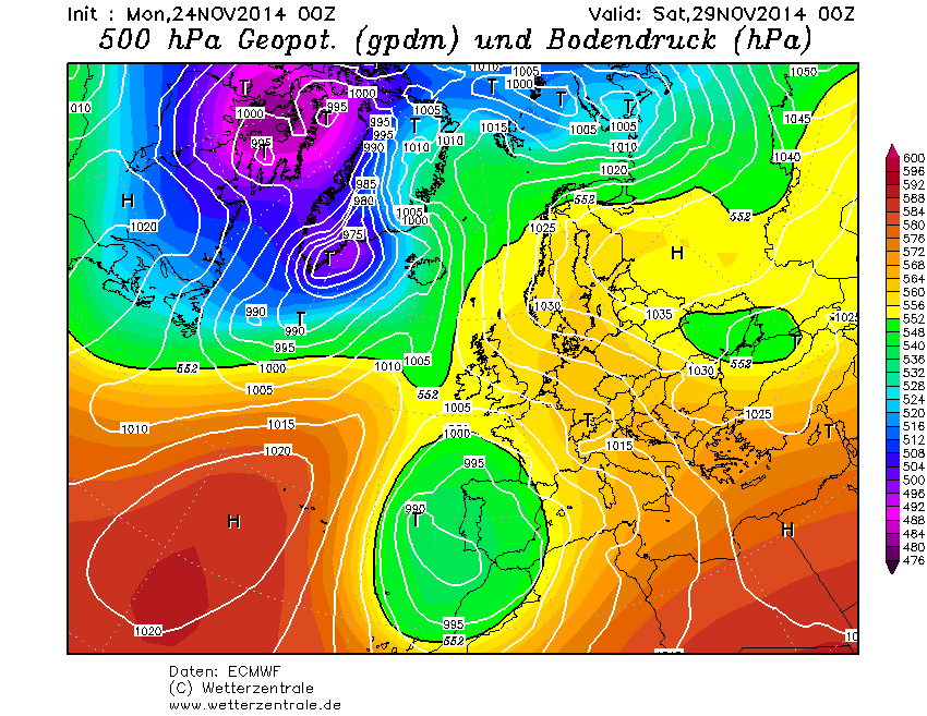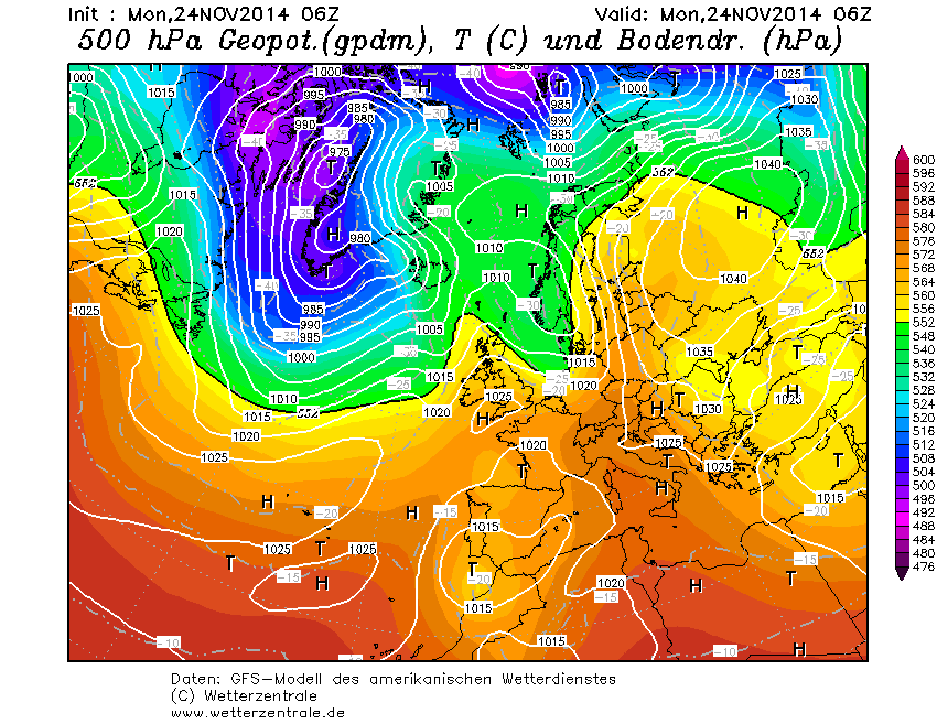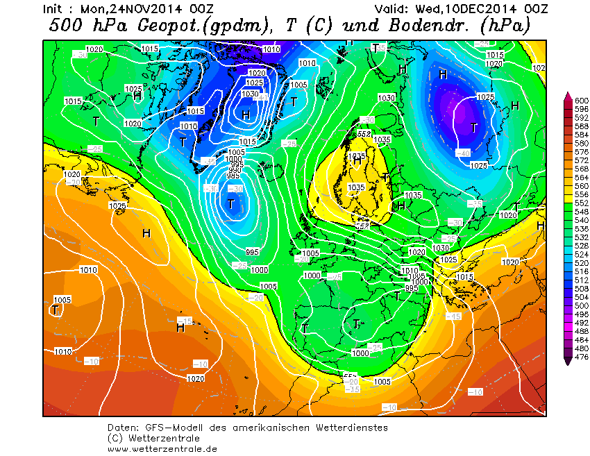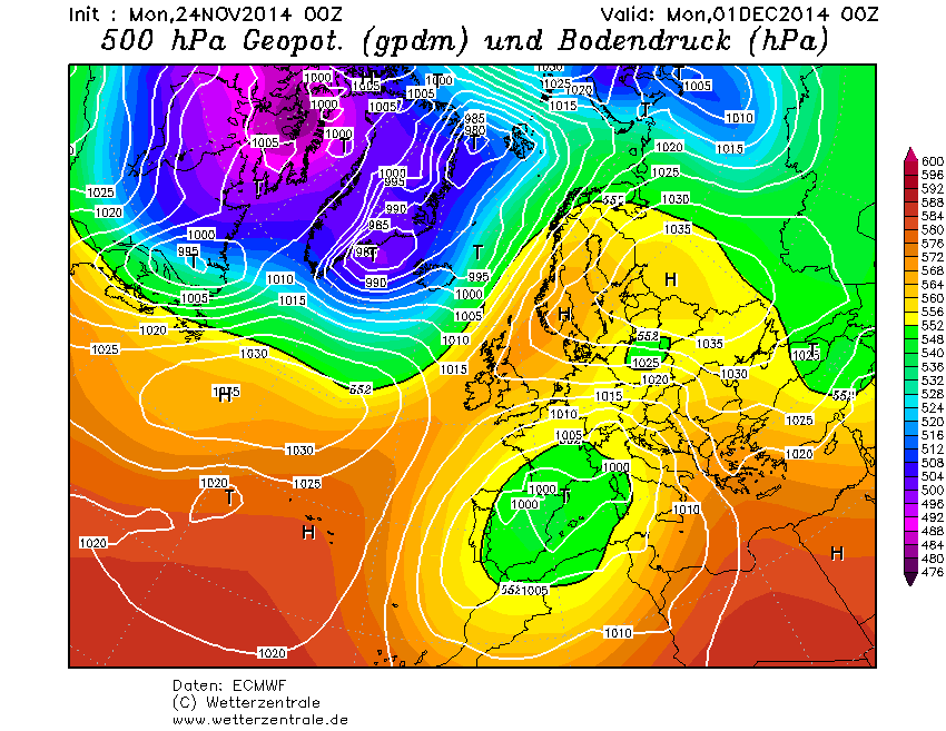Het continentale hogedrukgebied handhaaft zich en de uitloper boven Scandinavië is weer iets sterker en een depressie bij IJsland lijtk er niet door te komen. De trend luidt dus: consolidatie van de quasi-winterse setting. Het hogedrukgebied ligt wel erg zuidelijk en bij ons is de wind nog steeds zuidoost. Aanvoer van winterkou is dus nog niet aan de orde, al zal de continentale situatie wel voor enige afkoeling zorgen.