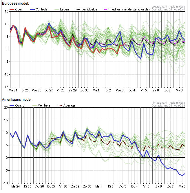 Het EC-model verschilt hier in de oper wel iets van het GFS-model: de wind is hier oost geworden, wat resulteert in lagere temperatuurprognose.