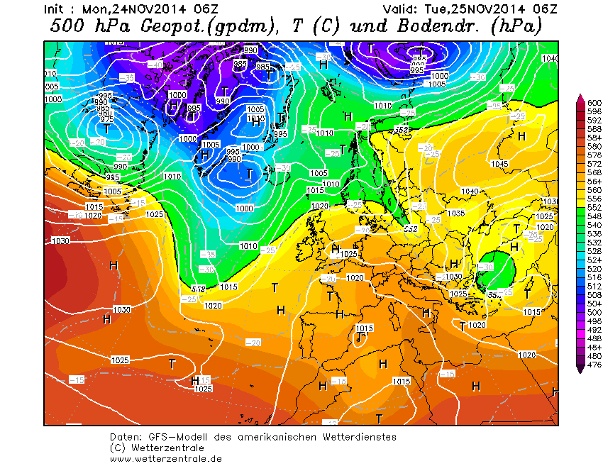 Op de kaart van GFS over 24 uur lijkt het hogedrukgebied zich iets terug te trekken naar het oosten maar een nieuwe rug lijkt zich te ontwikkeling boven Scandinavië, lage druk bij Turkije blijft.