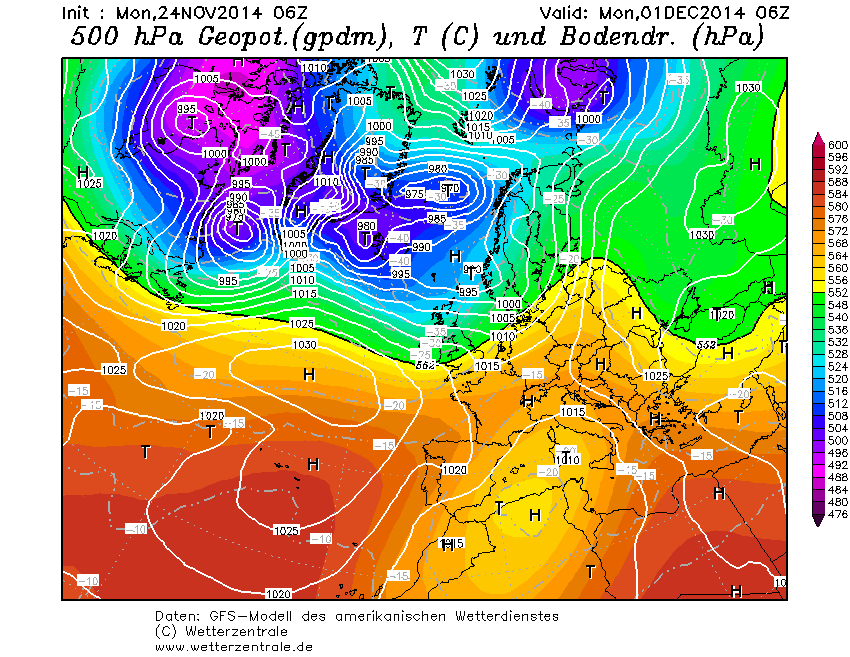 GFS geeft al een heel ander beeld in de run van vanochtend 6 uur: dan zou de depressie bij IJsland een dikke vinger in de Europese pap krijgen en daarmee is iedere winterse aspiratie op middenlange termijn verdwenen.