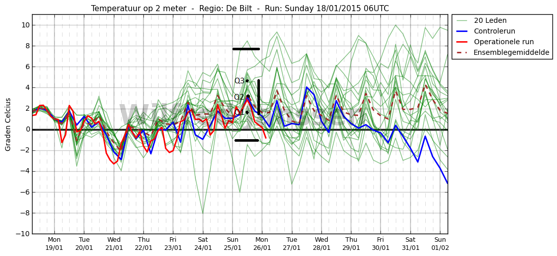 Ik heb even de pluim van Wilfred gebruikt als voorbeeld. Meestal is het moeilijk of zelfs onmogelijk om de lijntjes te tellen, dus heb ik snel bij benadering Q1 en Q3 aangeduid. Die geven aan waar respectievelijk de 25% laagste en 25% hoogste waarden beginnen. Q2 is de mediaan (50% lager en 50% hoger). De interkwartielafstand bedraagt ongeveer 3. Vermenigvuldigd met 1.5 zorgt dit voor 3,25 +- 4,5. De grenzen zijn 7,75 en -1,25. Er zijn dan 2 uitschieters in deze pluim volgens deze methode. Tevens is het wel mogelijk om meerdere 'uitschieters' te hebben langs dezelfde kant.