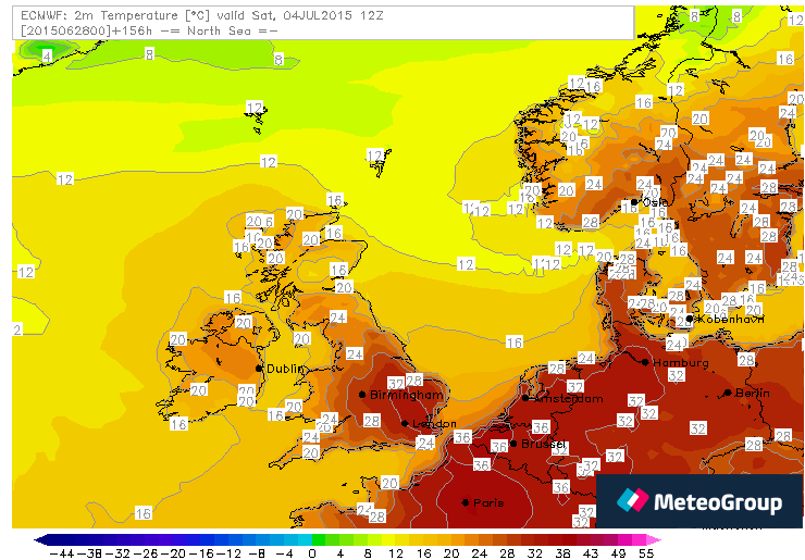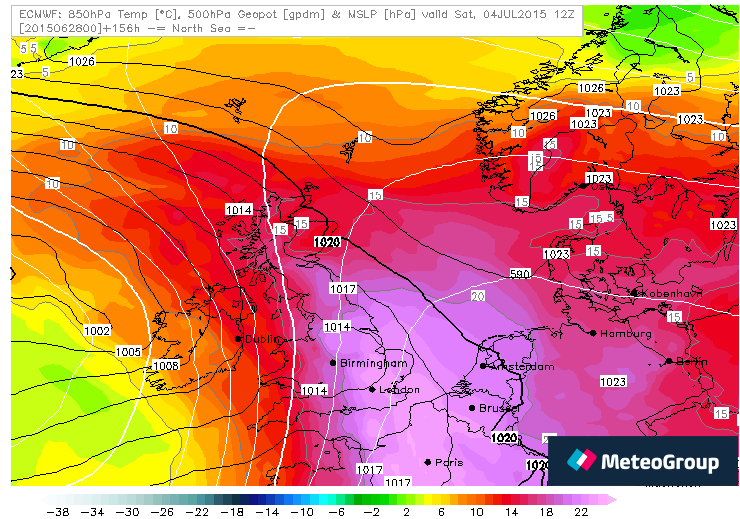 Dit is voor zover ik me kan herinneren de eerste keer dat ik in de ruwe uitvoer van EC 36 graden zie ingetekend worden boven de Benelux. De daarbij berekende 850hPa-temperaturen liggen rond de 23 graden boven het zuidwesten van de Benelux.