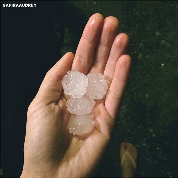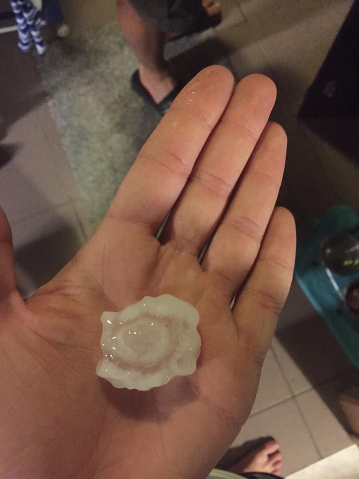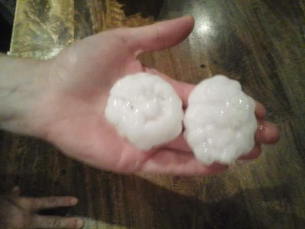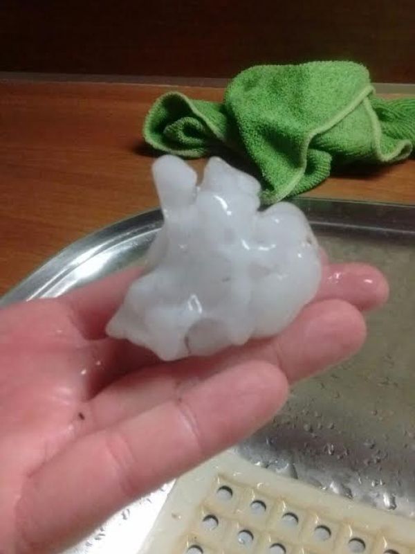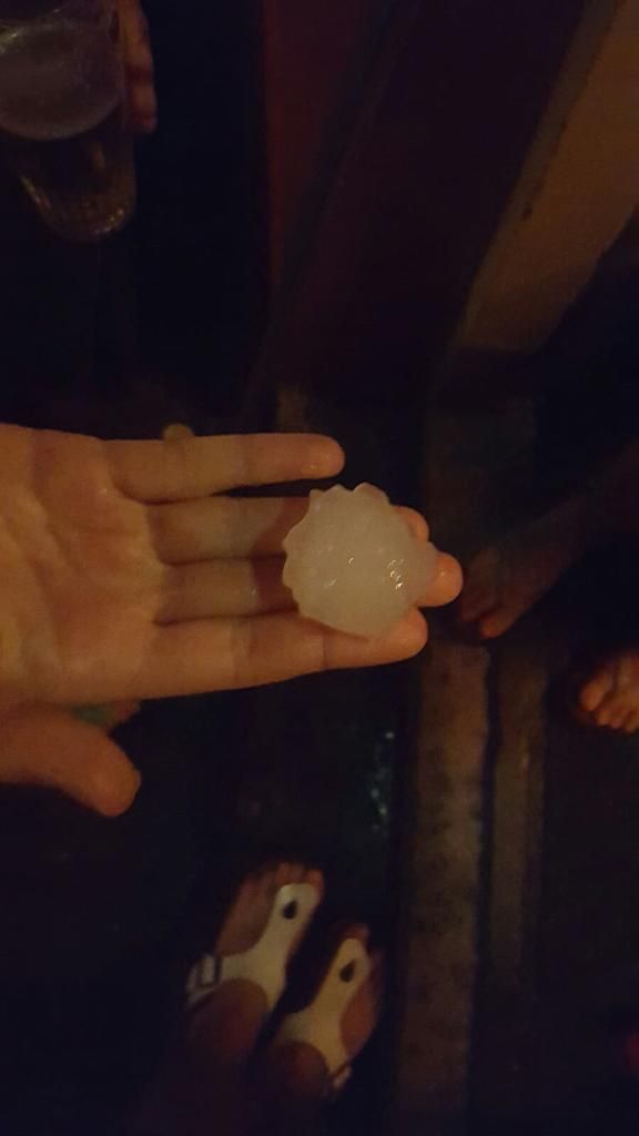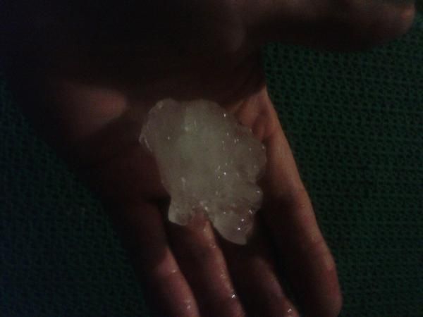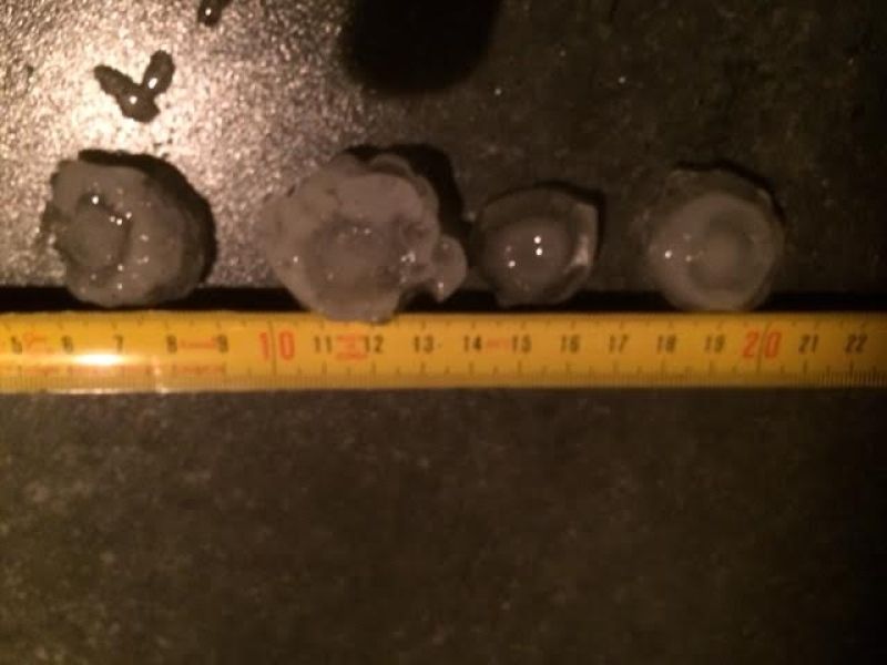 Daarnaast is ook in Zeeland behoorlijk grote hagel naar beneden gekomen (foto 2 t/m 5). Gezien de tijdstippen waarop die foto's binnenkwamen, vermoed ik dat die door twee verschillende supercells zijn geproduceerd. De eerste 3 (van de grootste stenen) lijken te horen bij de supercell die rond 22 uur (CEST) over Zeeland trok, en de stenen op foto 5 lijken te horen bij de supercell die rond 23:40 passeerde. Die foto werd namelijk om 23:53 geplaatst, en de maker meldde dat de foto's 10 minuten daarvoor zijn gemaakt.