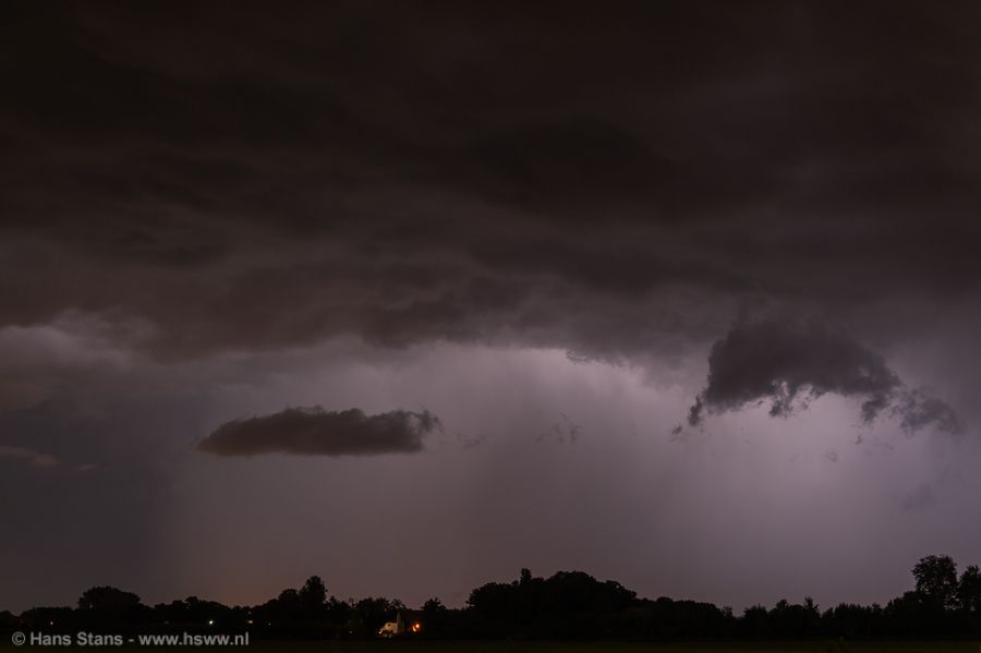 naar dit topic toe aan het Skywarn-dossier van deze dagen! Hier een foto van de iets meer zuidelijke uitstekende cel met hagelscherm die zondagavond de grote hagel bracht over de A50 en regio Oss, ik stond er eigenlijk niet fijn, geen zicht op de ontladingen en pal boven me een laaghangende en kolkende basis van de stijgstroom