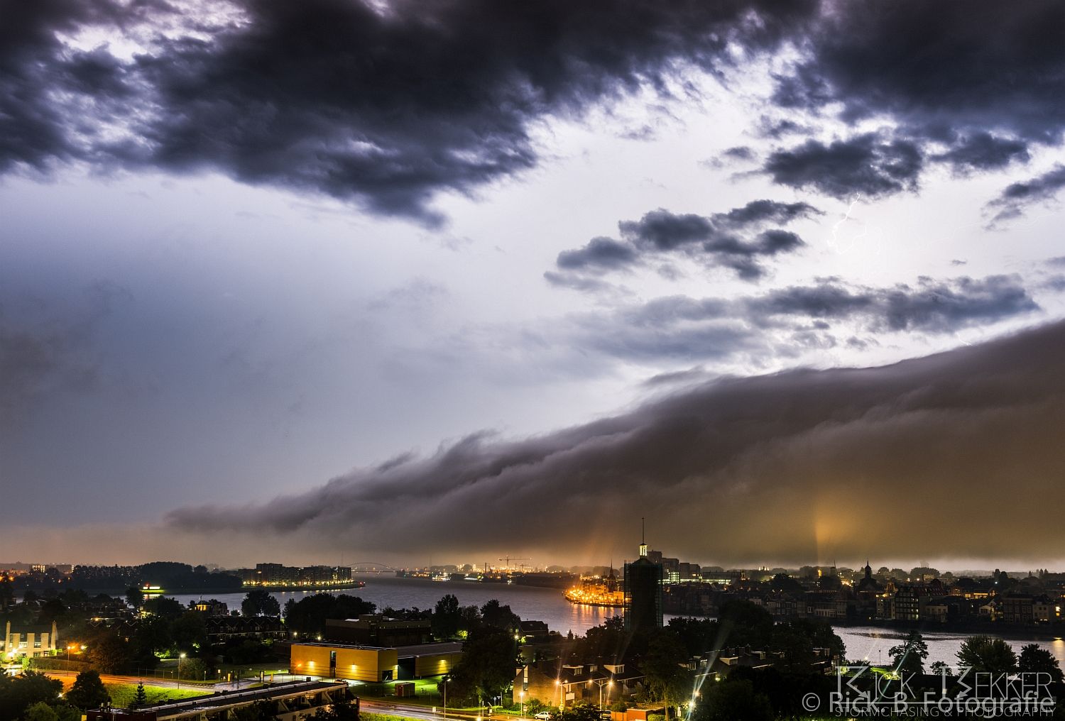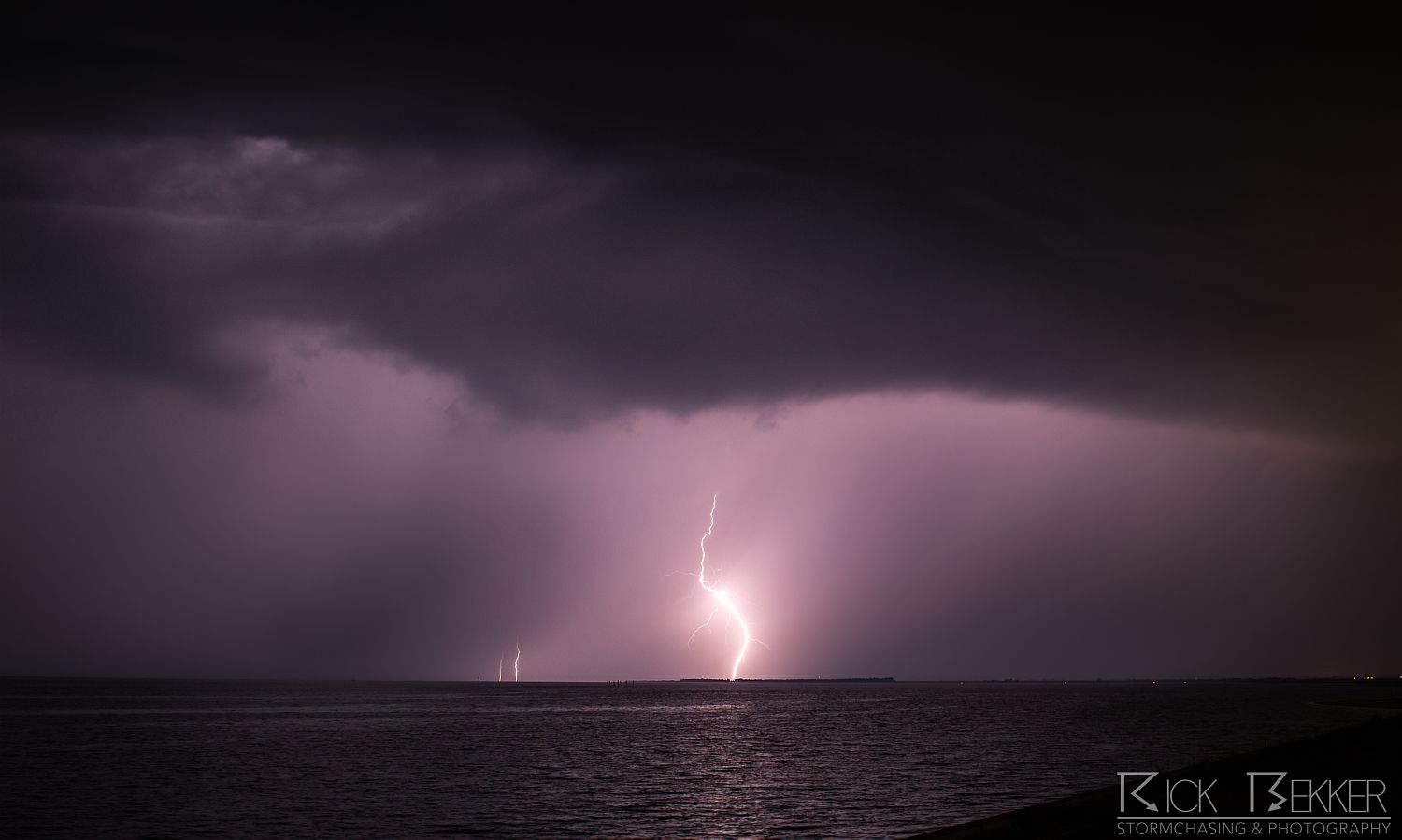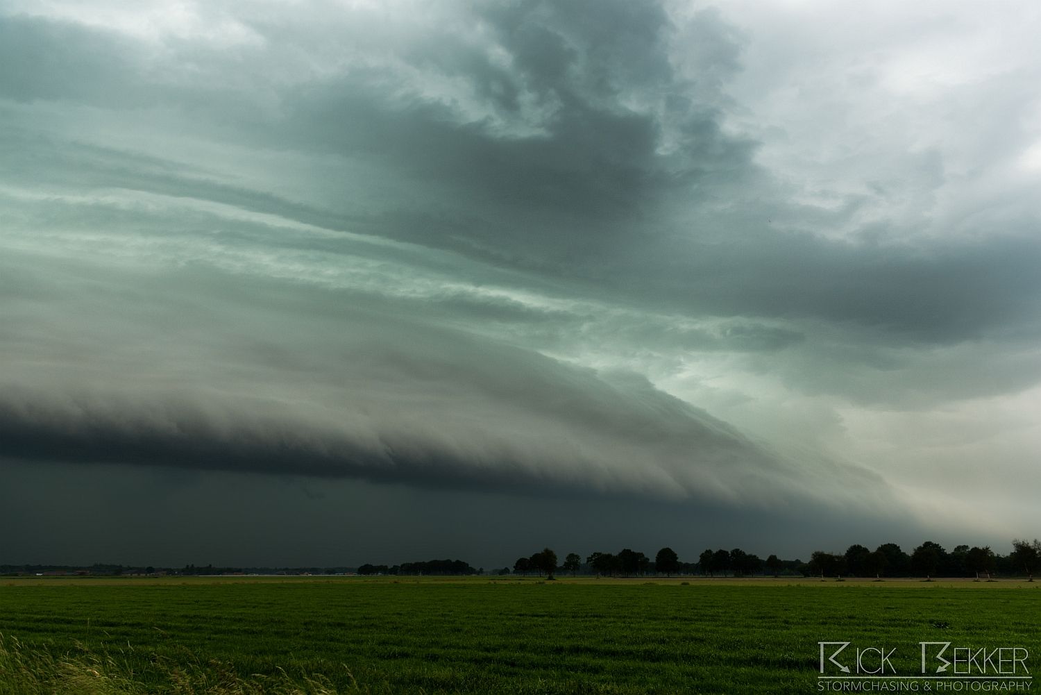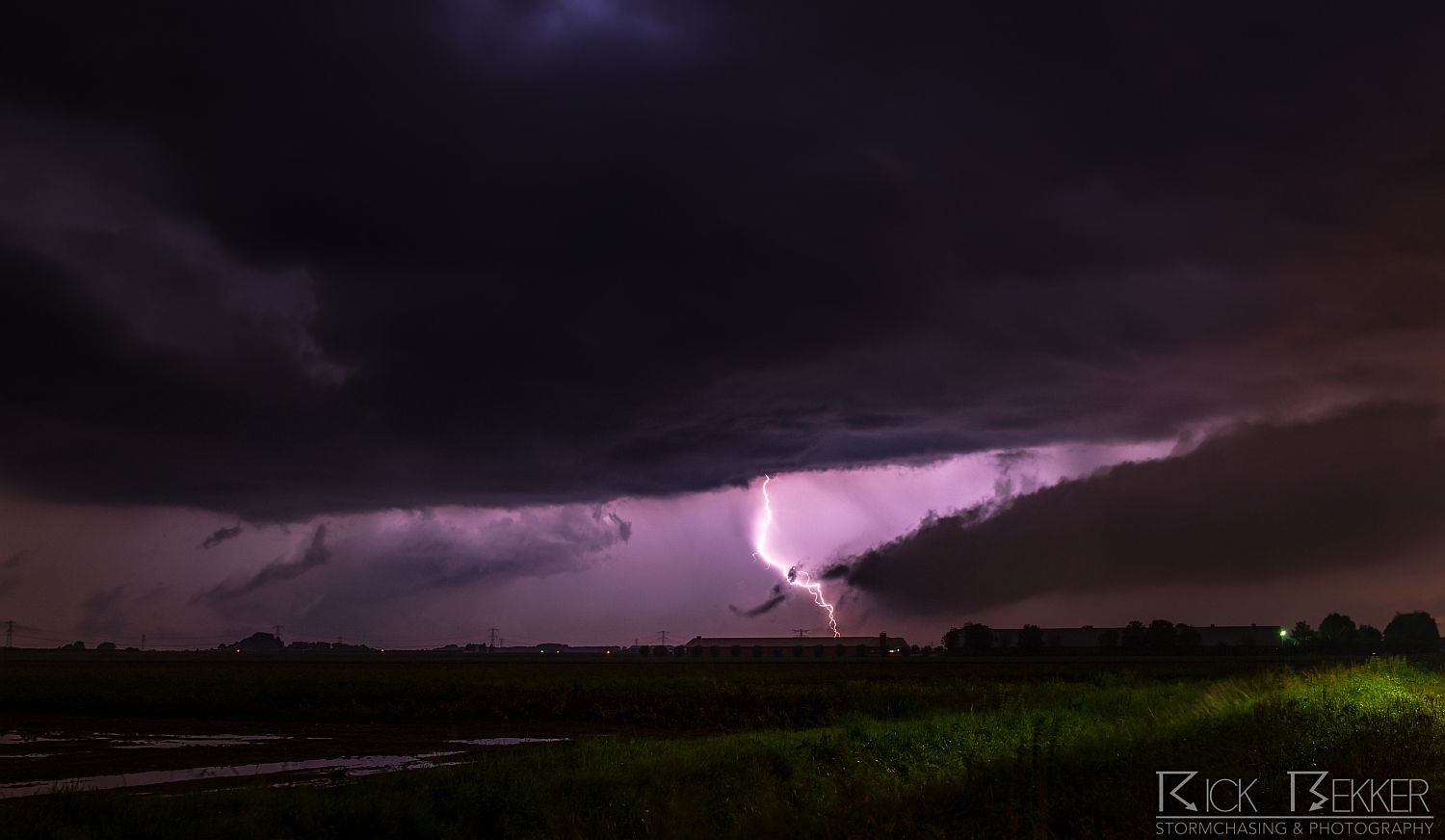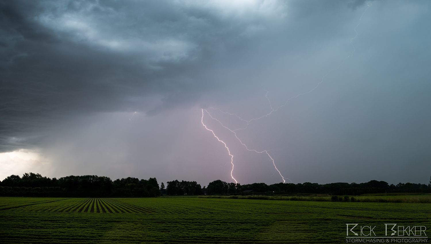 Een felle bow-echo stormde met een rotgang op onze locatie af. Diverse bliksemontladingen waren zichtbaar onder een wazige arcus. De contrasten waren helaas niet erg fraai ten tijde dat de bow-echo ons naderde.