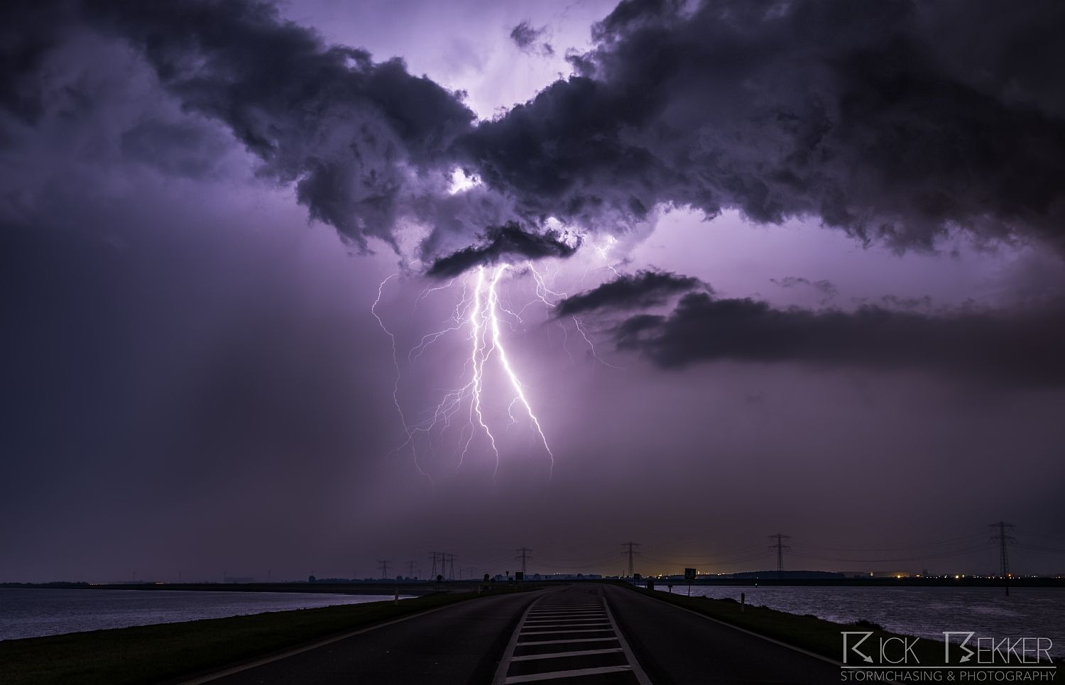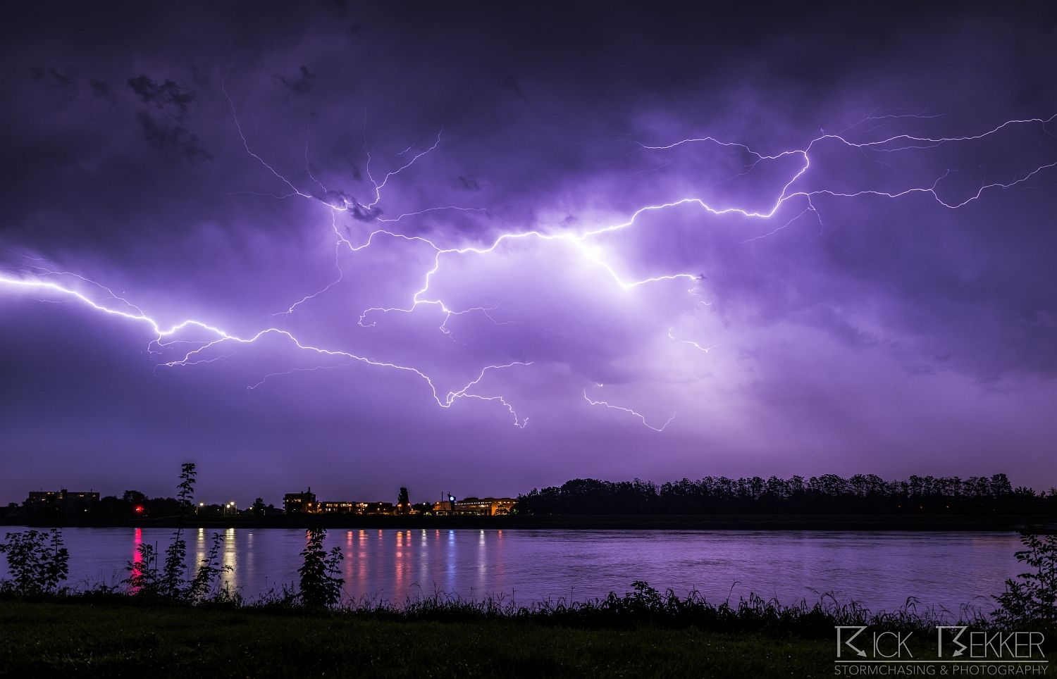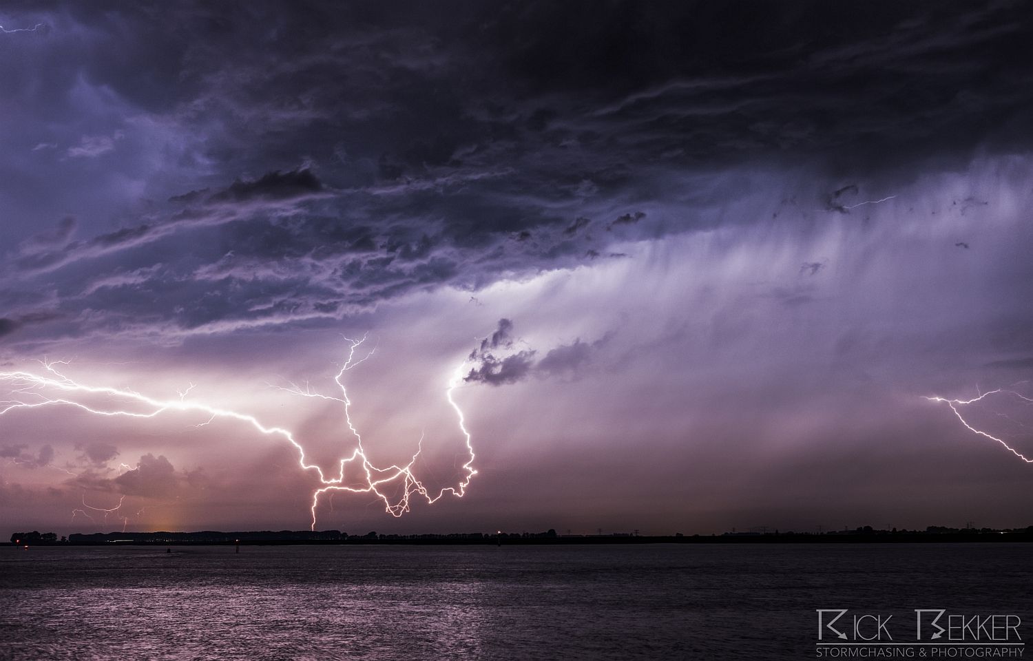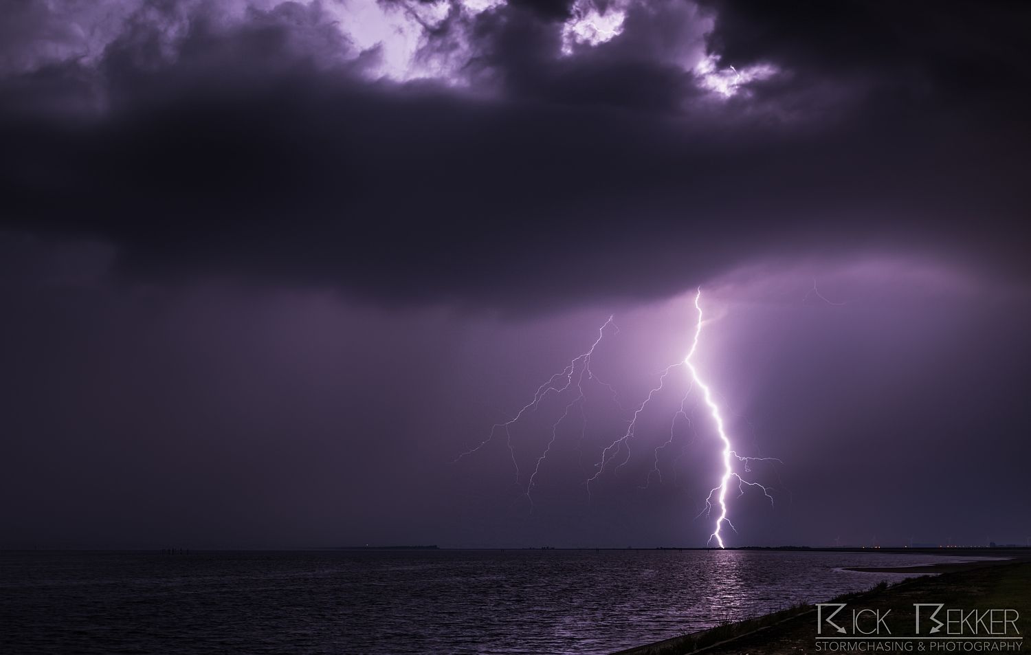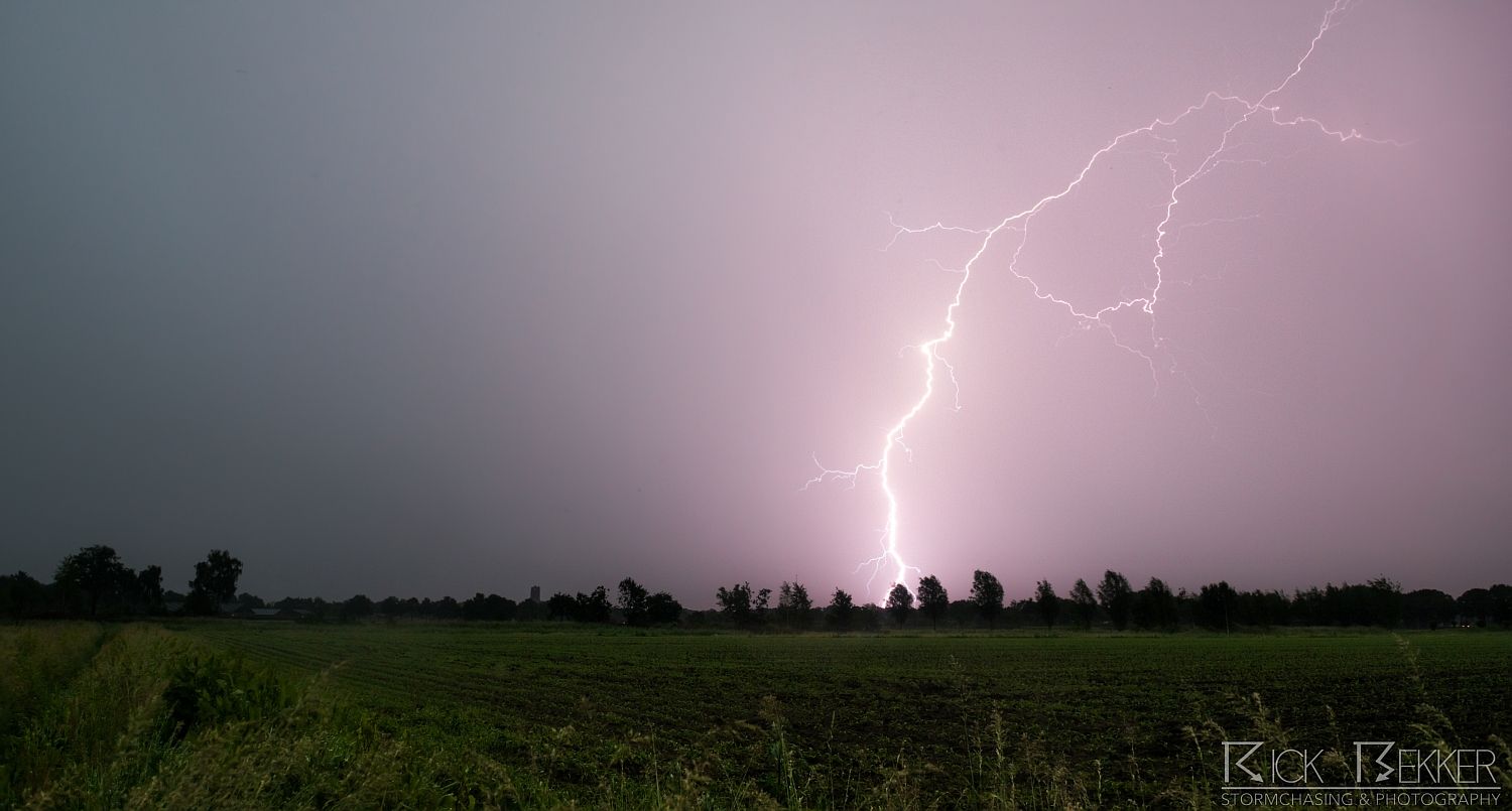 Plotseling werd alles paars opgelicht en zag ik een bijzonder felle CG+ ontlading inslaan op een slordige 8 kilometer ten zuiden van mijn locatie. Deze ontlading was van een veel zwaarder amperage dan de ontladingen op de bovenstaande foto's . Het resultaat: een zwaar overbelichte foto in het RAWbestand. In Adobe Photoshop Lightroom heb ik de foto nog enigszins kunnen redden door ruim 2 stops onderbelichting toe te passen.