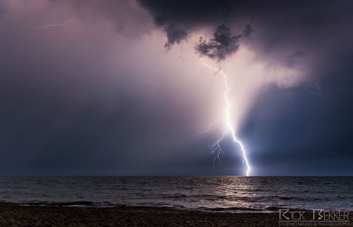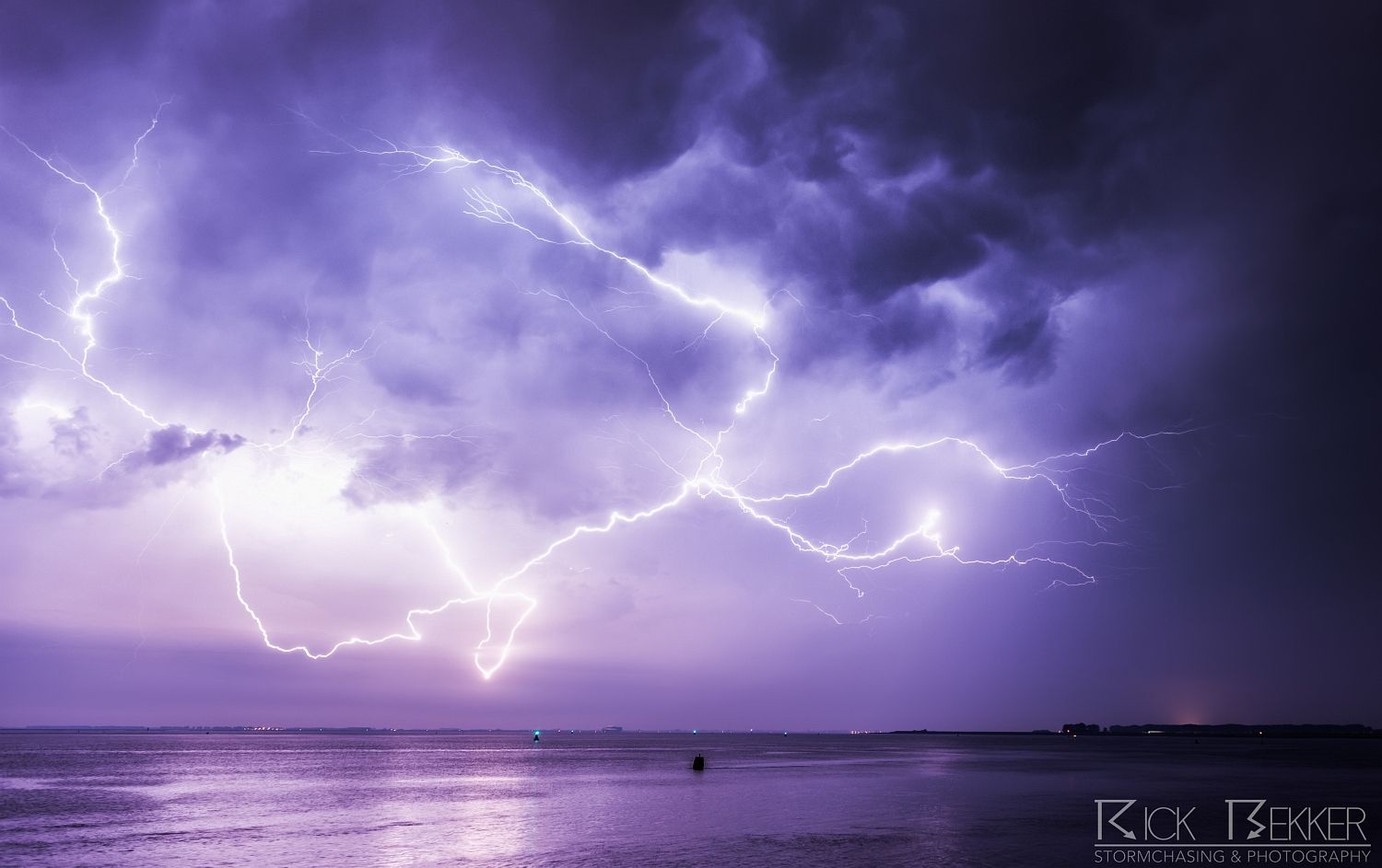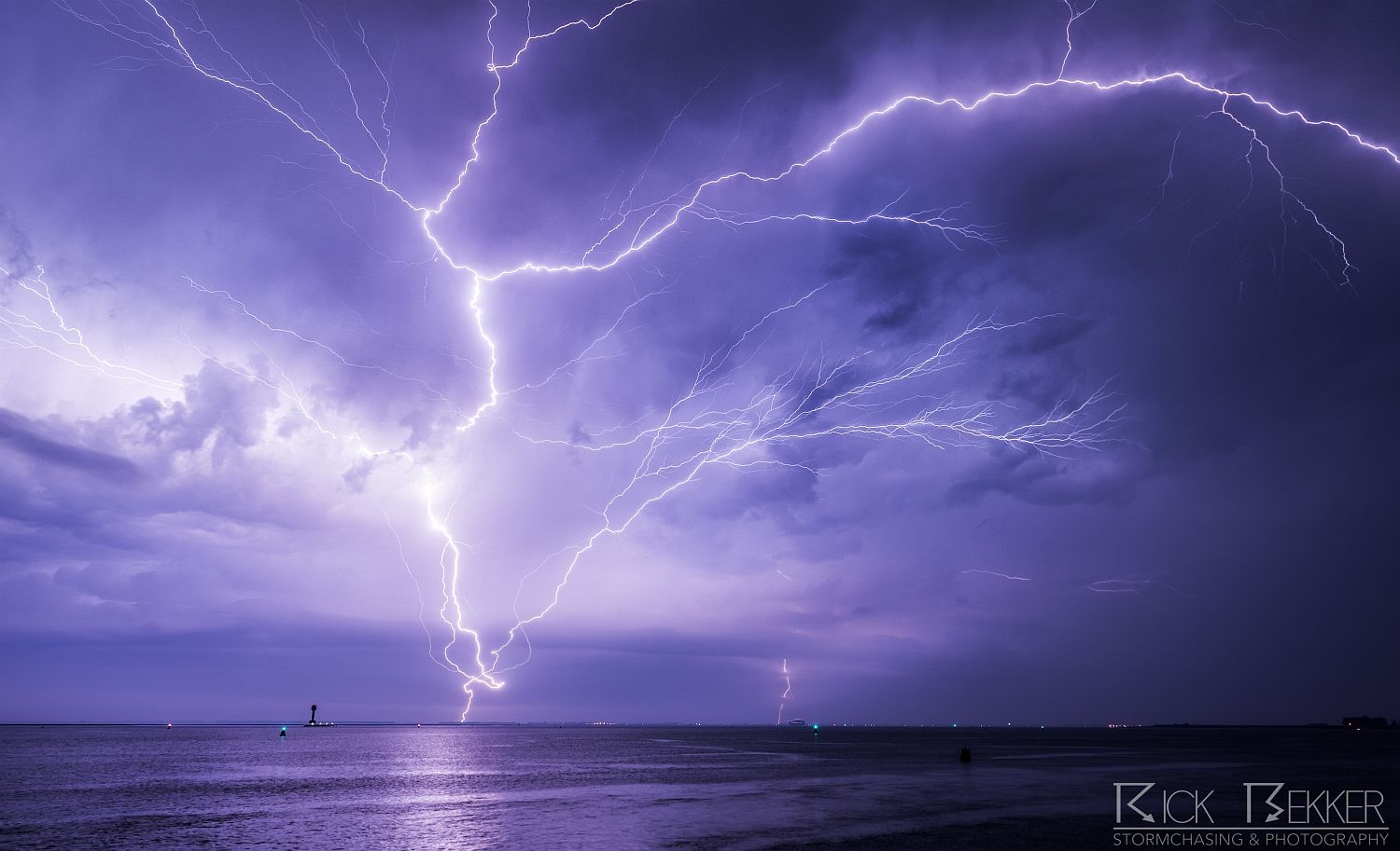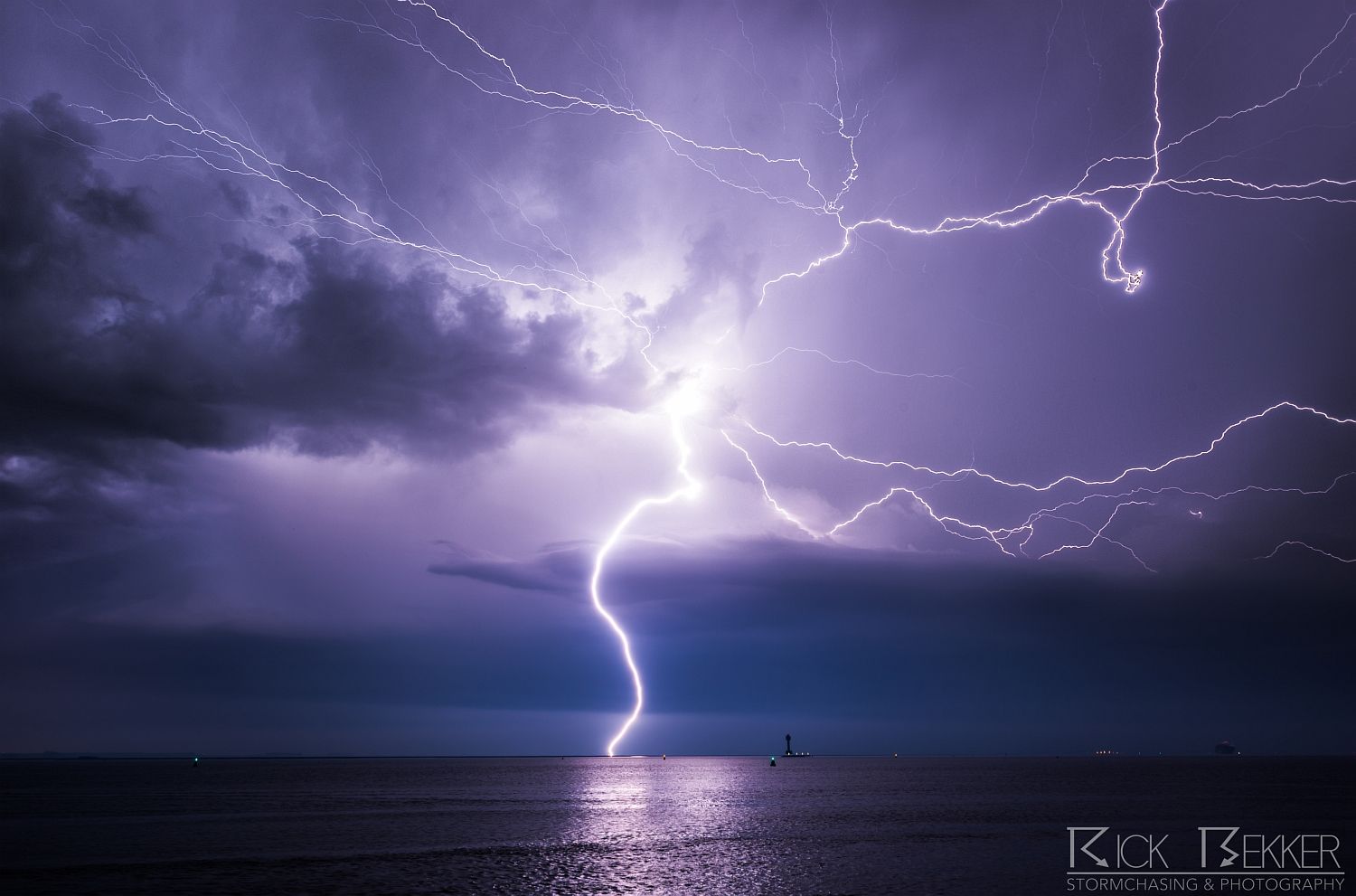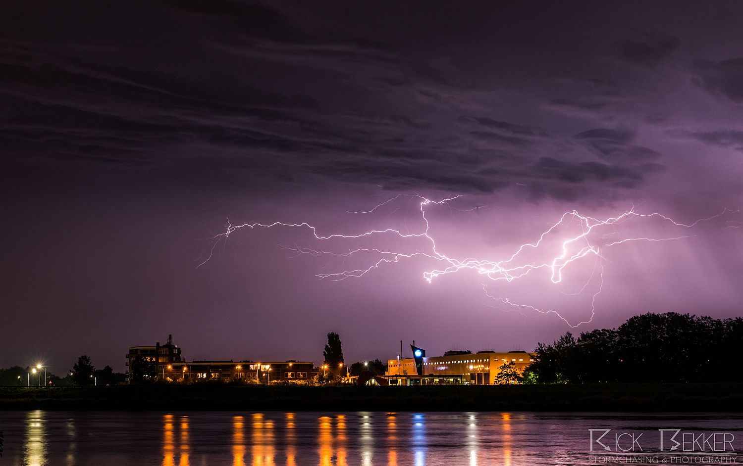 Plotseling werd alles paars opgelicht en zag ik een bijzonder felle CG+ ontlading inslaan op een slordige 8 kilometer ten zuiden van mijn locatie. Deze ontlading was van een veel zwaarder amperage dan de ontladingen op de bovenstaande foto's . Het resultaat: een zwaar overbelichte foto in het RAWbestand. In Adobe Photoshop Lightroom heb ik de foto nog enigszins kunnen redden door ruim 2 stops onderbelichting toe te passen.