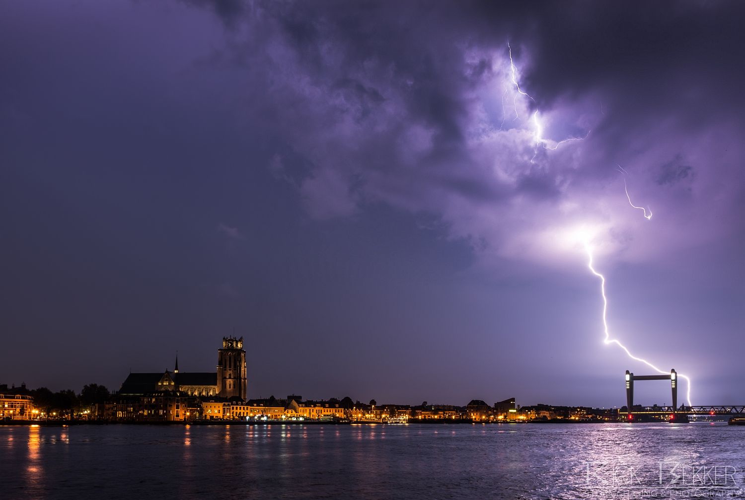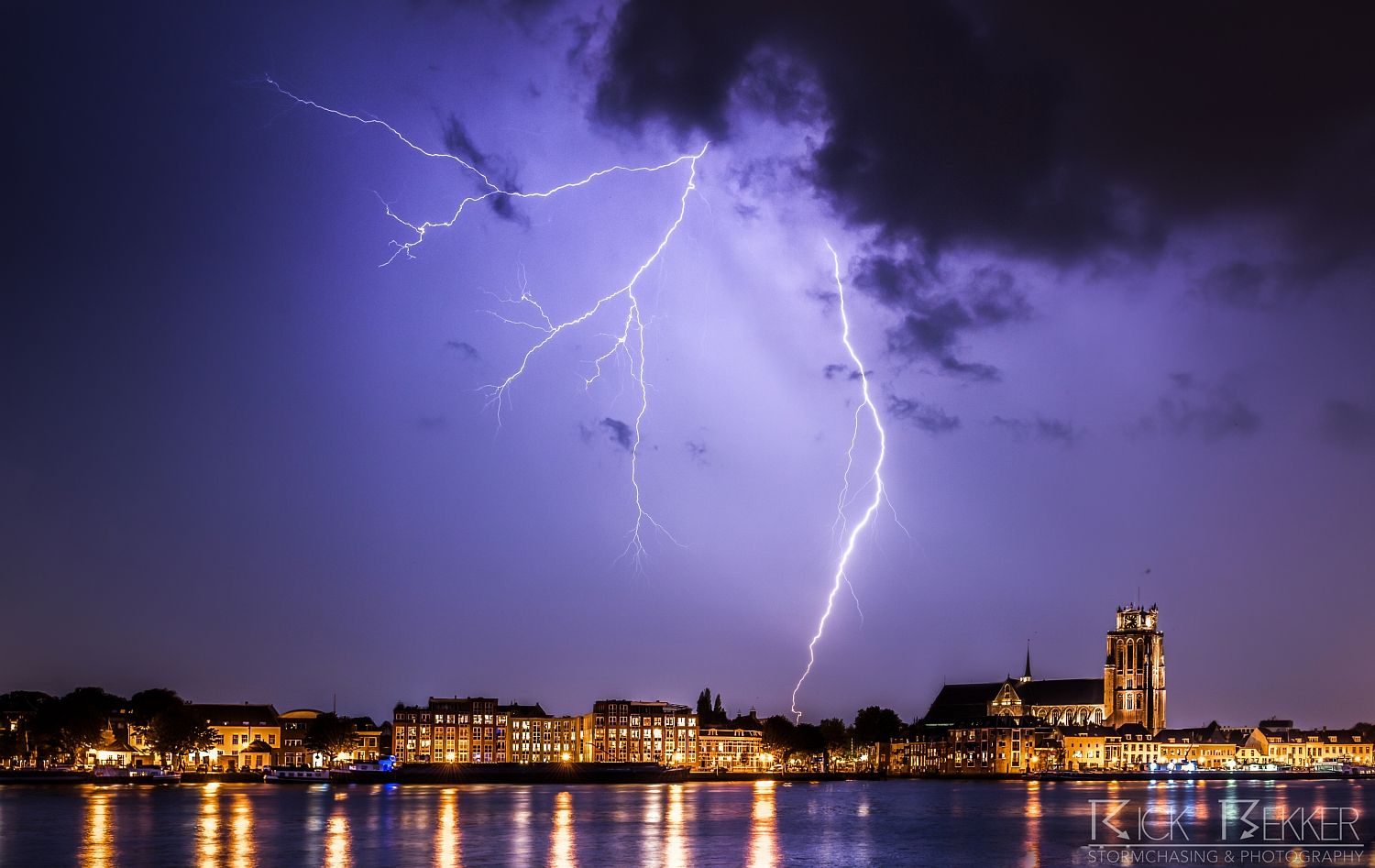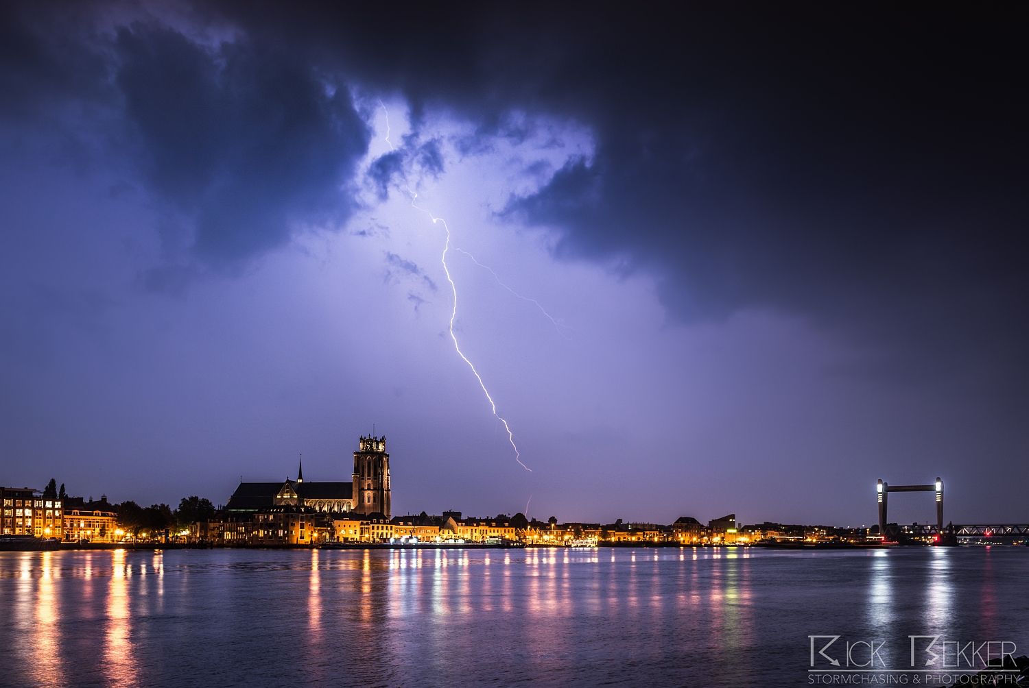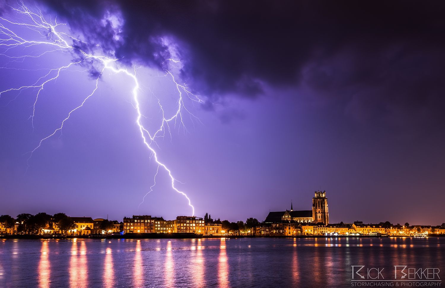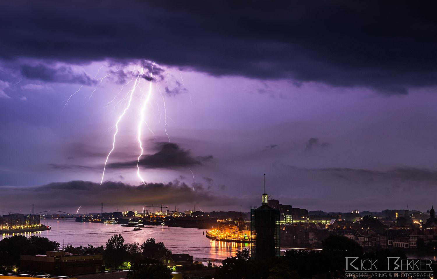 Plotseling werd alles paars opgelicht en zag ik een bijzonder felle CG+ ontlading inslaan op een slordige 8 kilometer ten zuiden van mijn locatie. Deze ontlading was van een veel zwaarder amperage dan de ontladingen op de bovenstaande foto's . Het resultaat: een zwaar overbelichte foto in het RAWbestand. In Adobe Photoshop Lightroom heb ik de foto nog enigszins kunnen redden door ruim 2 stops onderbelichting toe te passen.