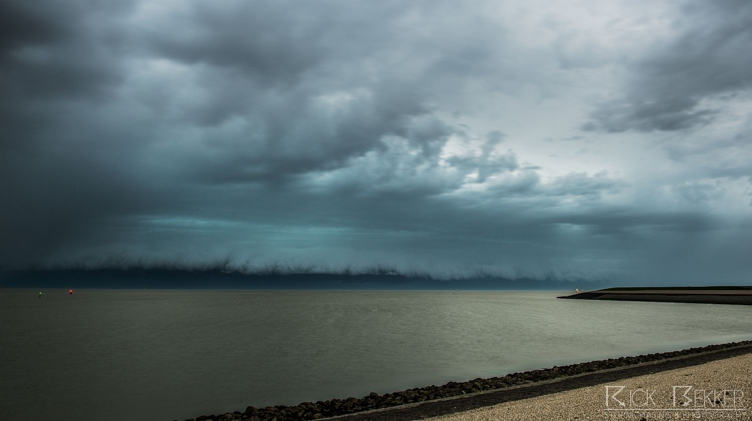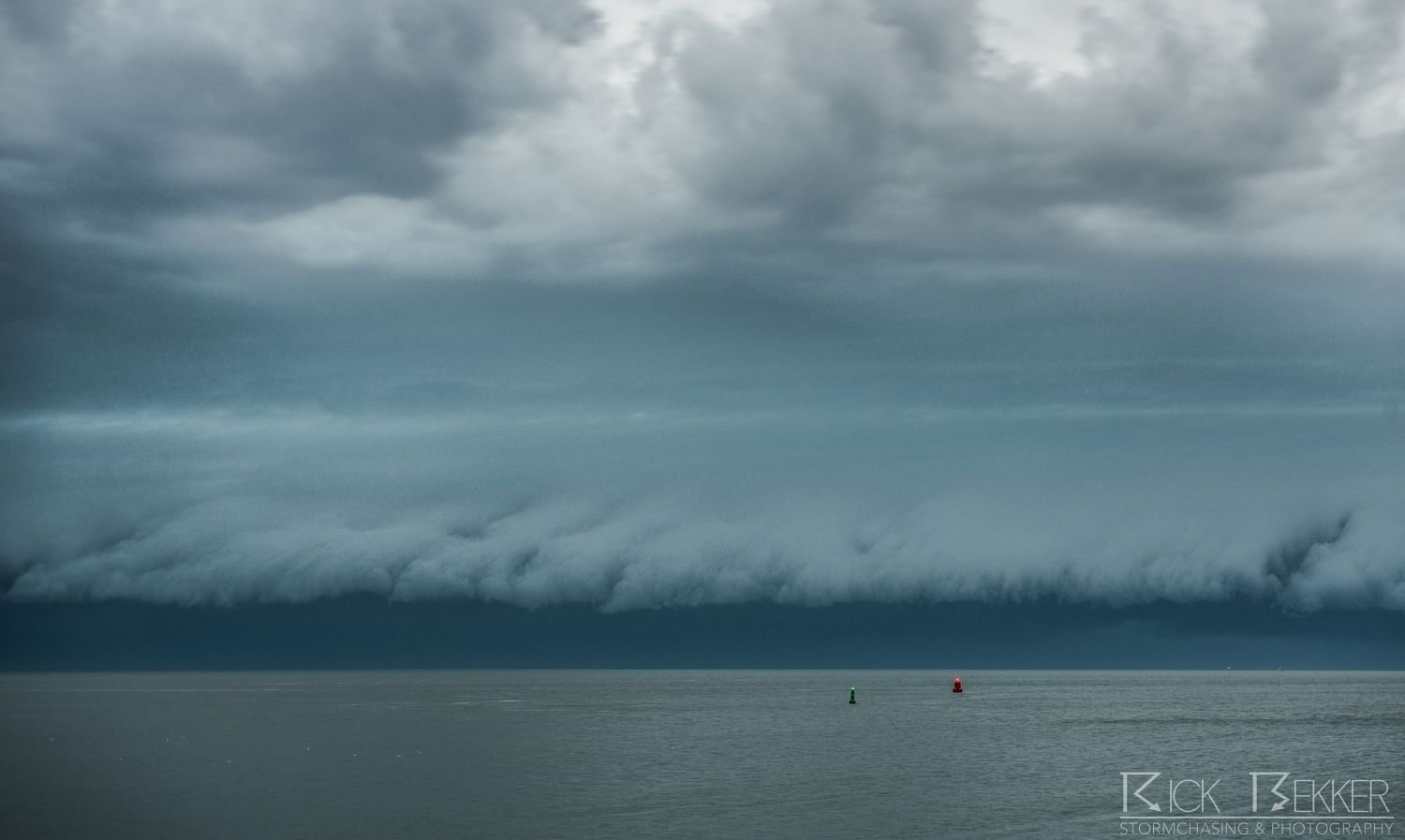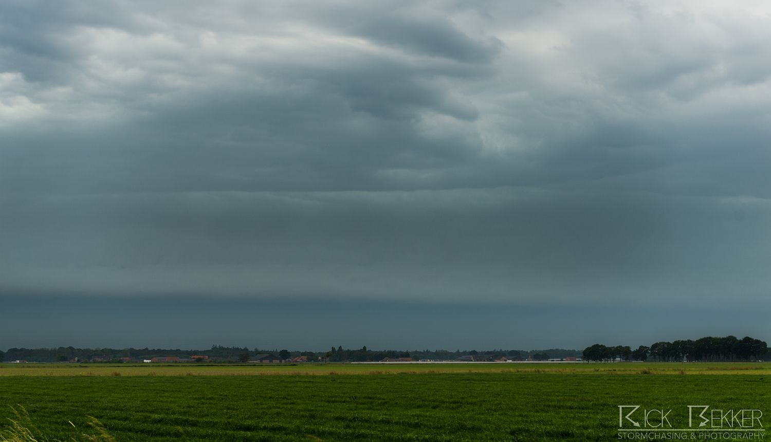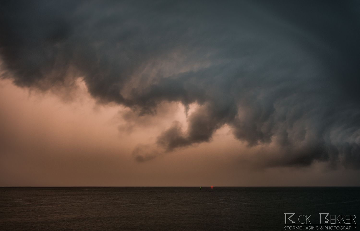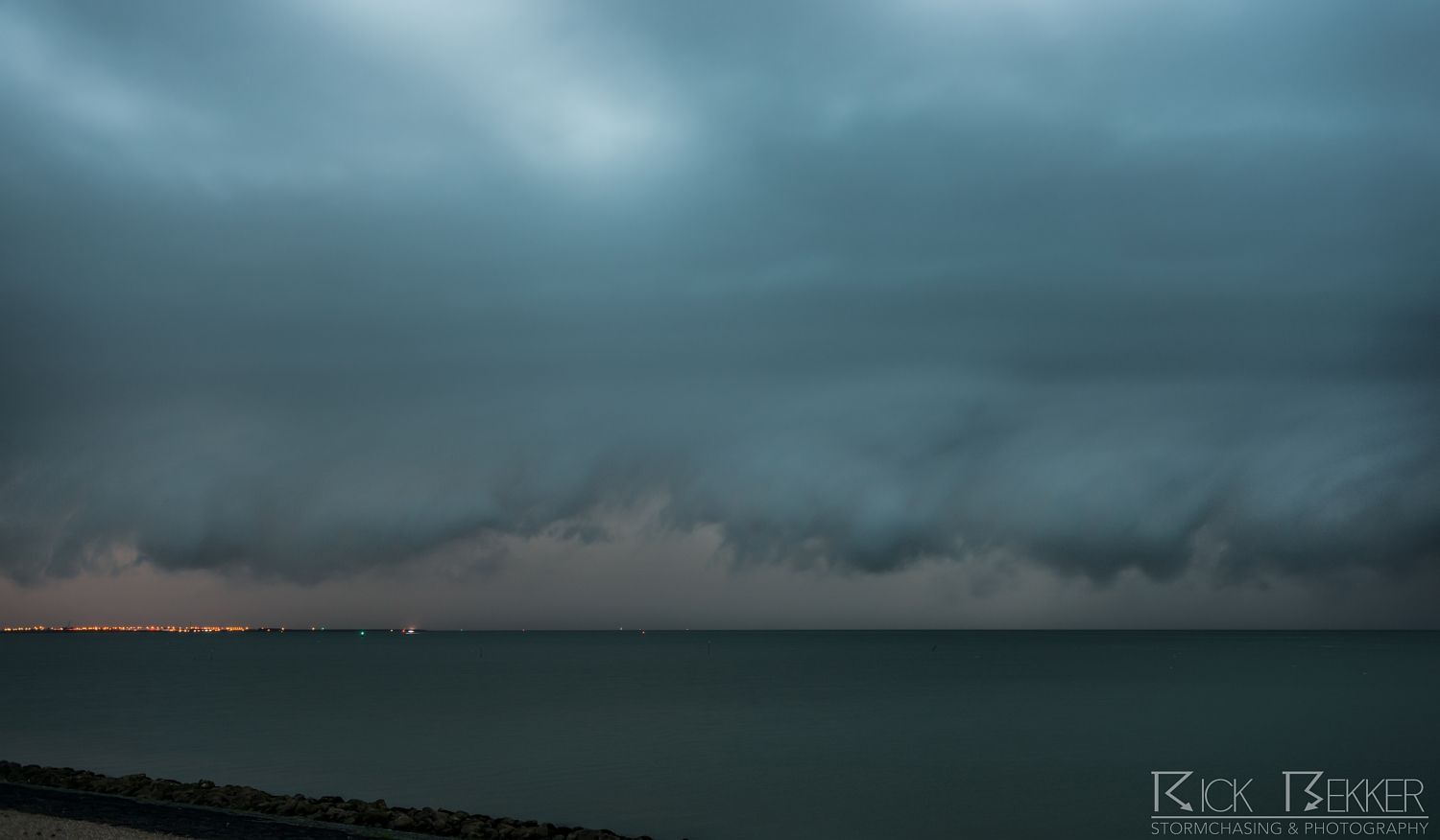 Later die avond was het tijd voor de beloofde buienlijn. Voor de bow-echo ons zou bereiken was er een fraaie shelfcloud zichtbaar behorend bij het noordelijke deel van de buienlijn.