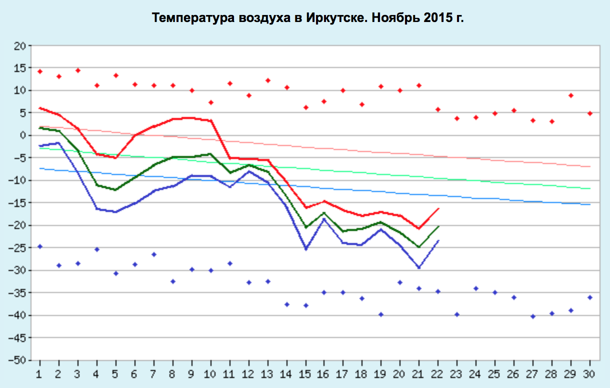 In Irkutsk, zuidelijk in het midden van Siberië is het al een week zeer koud, kouder dan normaal in januari. De temperatuur ligt sinds 8 dagen meer dan 10 graden onder normaal.