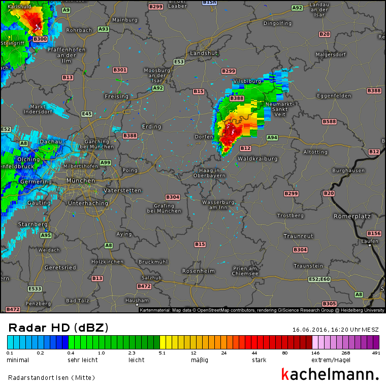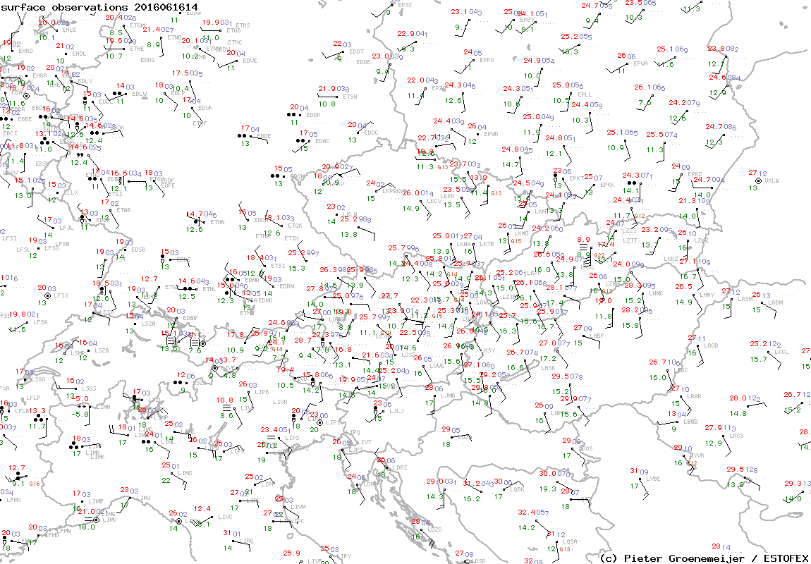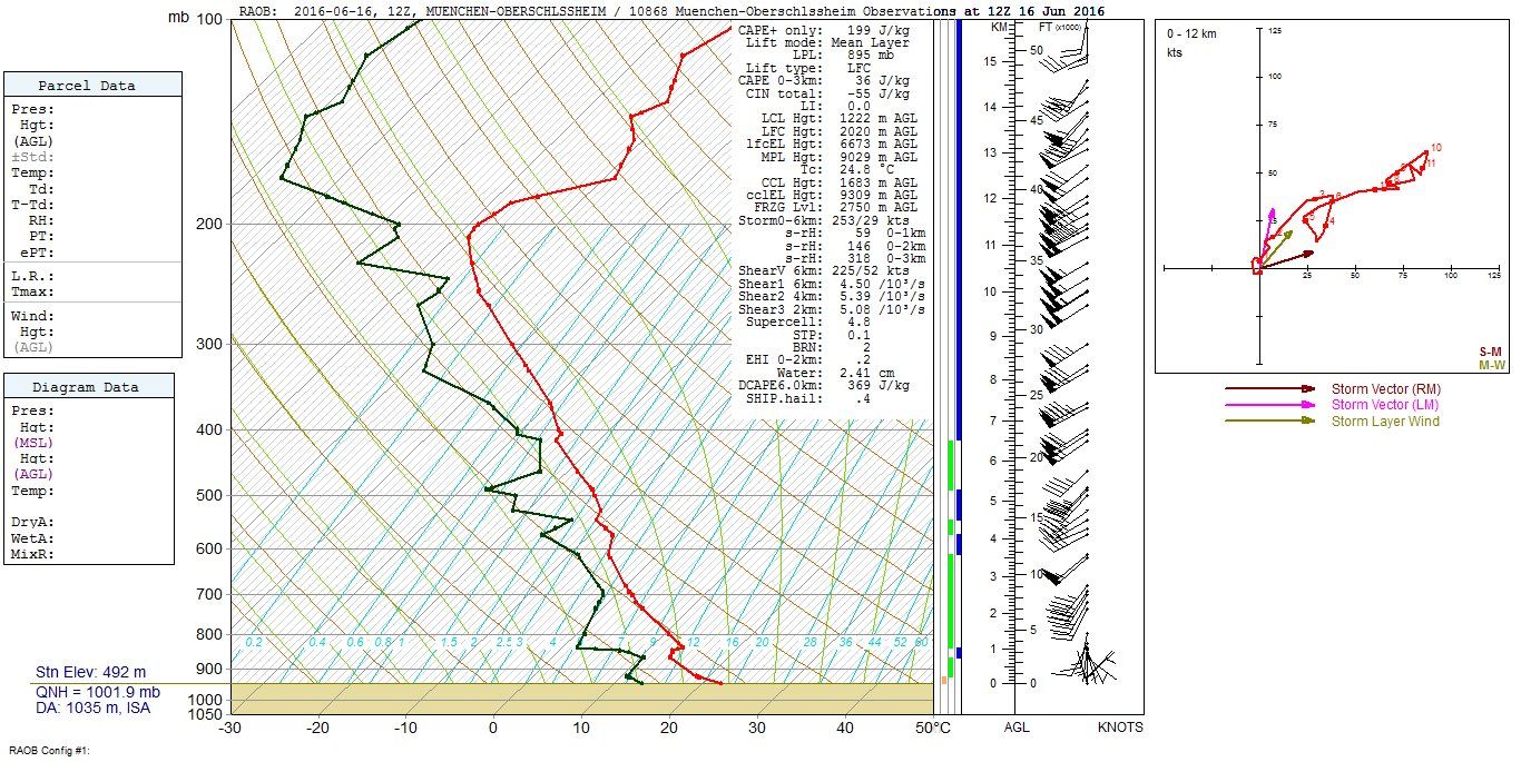 en de vorm op de radar laat wel zien dat het aan windschering niet ontbreekt. Wel moet gezegd worden dat de 12Z-soundings uit ZO-Duitsland, Tsjechië en Oostenrijk maximaal slechts zo'n 200 J/kg aan MLCAPE lieten zien, wat nogal mager is. Onderstaande sounding van München laat die 200 J/kg zien. Dat zal de afgelopen paar uur vermoedelijk nog iets op zijn gelopen door de aanwezige convergentie, en de bijbehorende verdieping van de vochtige grenslaag, maar het blijft vermoedelijk vrij mager.