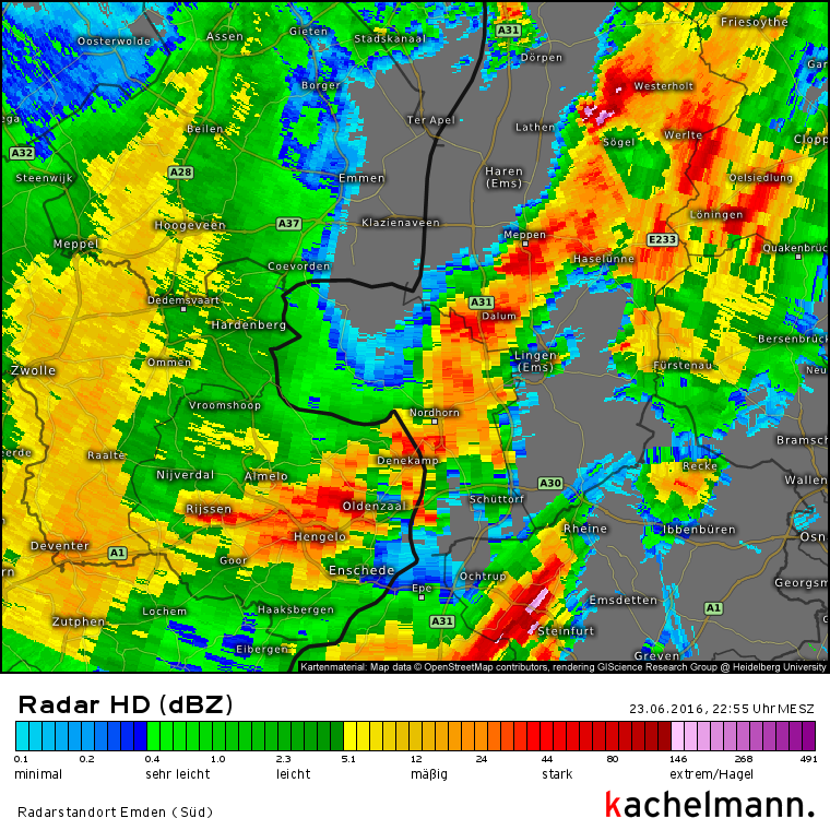 Ik besloot Duitsland in te gaan en een van de Left Moving Supercells te pakken die in sequentie nabij Haren (Ems) geboren werden. De eerste zat achter wat regen waardoor we die lastig konden zien vanaf een dam. Maar de tweede, veel actievere cel (gezien ontladingen), konden we makkelijk onderscheiden en volgen. De regenvrije basis was niet wat ik gehoopt had; er was een hoekige verlaging te zien, maar niet veel meer. Dat is gek voor een supercell met 65+ dBZ op de radar (bovenin het beeld van Kachelmann)...