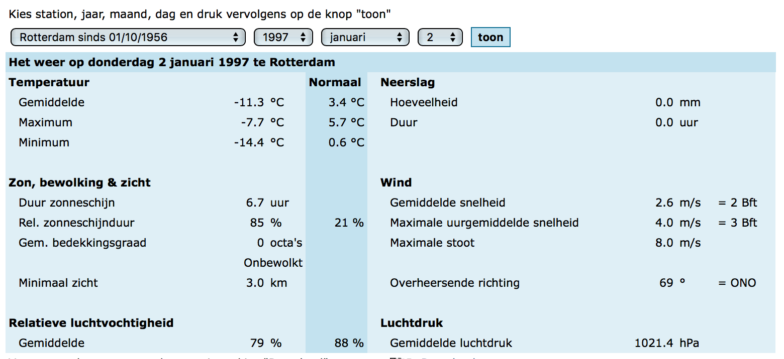 Ook een mooie dag was: schaatsen op mijn verjaardag, 2 januari 1997. Het KNMI had per journaal het bericht uitgegeven dat je beter binnen kon blijven wegens kou en harde wind. Maar geen wolkje aan de lucht. Die wind viel reuze mee. Dus een vriend en ik in Hillegersberg opgestapt om richting de Rottemeren te schaatsen, min of meer tegen die wind in. Er was helemaal niemand op dat prachtige, zwarte ijs, de zon scheen. We hebben ons toen terug laten blazen door diezelfde wind en de rest van de dag vervaagt in een mist van Beerenburg.....